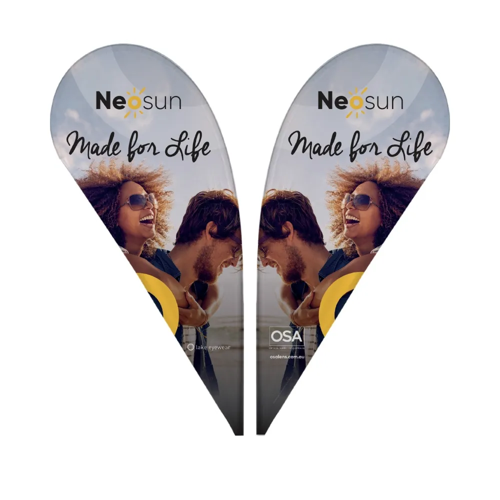 This advertising banner, tear drop flag has your designs digitally printed using a dye-sublimation process that provides an accurate portrayal of your graphics in vivid full colour to really draw the attention of passersby. Two separate woven polyester flags are printed on and then sewn together to create a 2-sided flag with graphics outwards on both sides, unlike single-sided print versions with a reverse image on the back. Our in-house team is available for design assistance, with three tier options to help you get the graphic help you need. Slimline Warehouse has quick shipping to anywhere in Australia with all of our products, check out the thousands of available items in our online catalogue and buy online today!