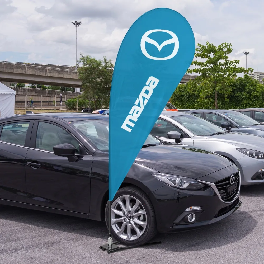 - Tear drop banner uses (2) woven polyester flags sewn together to show same graphics on both sides!