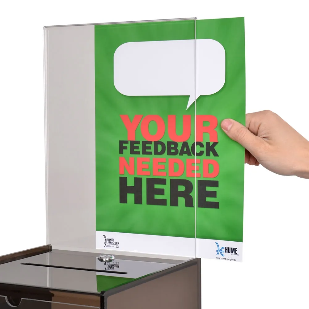 There are two graphic holders on the stand to help show visitors exactly what the display is for. The top and front can each hold an A4 (210 x 297mm) graphic in portrait orientation, and the simple slide-in design makes it easy to change out posters. The side of the collection box has a clear acrylic pocket that can hold forms up to 123mm wide. Using a clear pocket provides full view of displayed items, and is perfect for take-away brochures or suggestion cards. Slimline Warehouse provides same day despatch to anywhere in Australia with most in stock products ordered by 3pm EST, purchase today!
