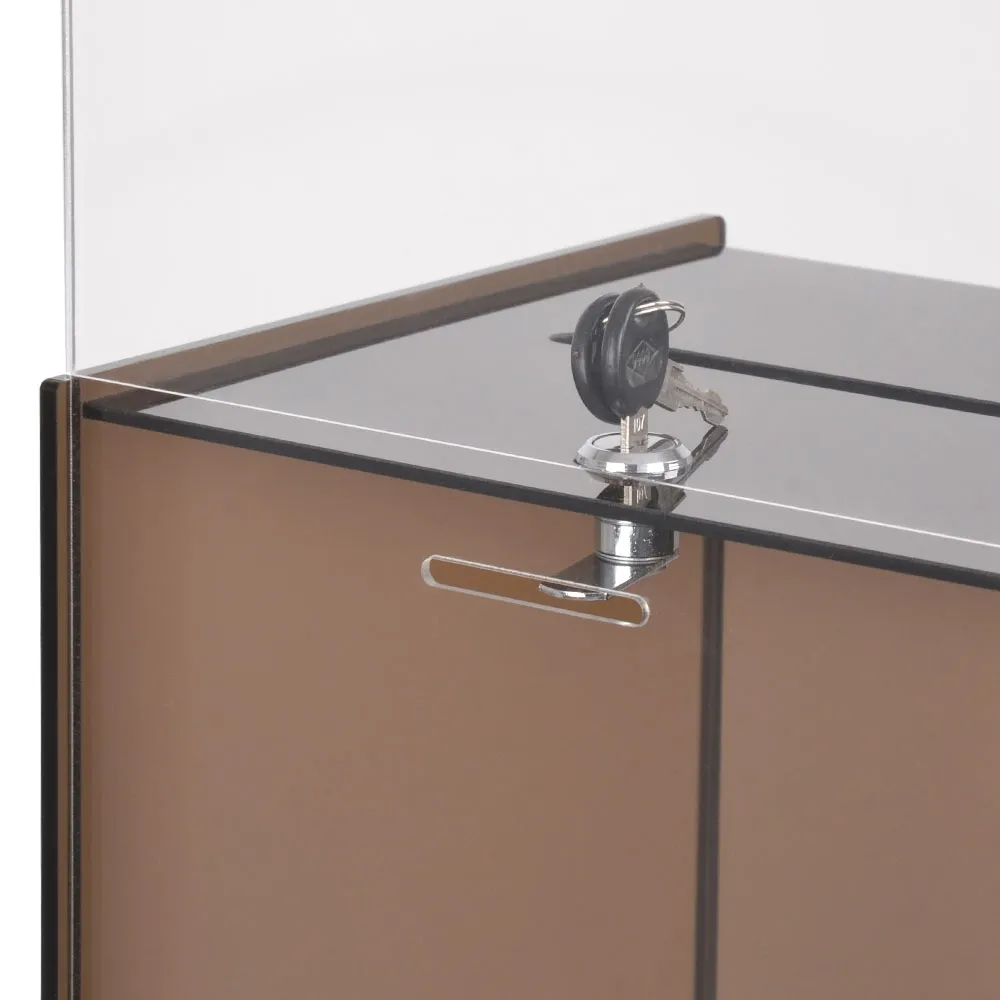 This comment card box is made from 5mm thick black acrylic, helping to keep the contents of the display hidden from view. A 150 x 10mm slot in the box is perfect for accepting different sizes of items. Like all our acrylic displays, polished acrylic offers a durable display that is low cost to work within any budget without compromising on quality! The lockable display helps secure case contents, with access to key holders made simple by unlocking the key and sliding up a hidden rear door.
