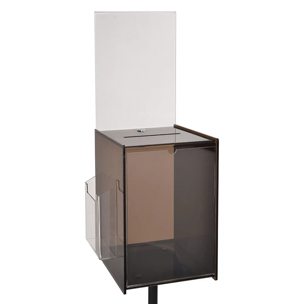 This floor standing suggestion box, comment card box is an easy way to collection suggestions, donations, and more anywhere in your business. The floor stand is 1580mm tall to easily be seen and help direct passersby towards the box to submit their comments or donations. The stand itself is made from black aluminium for a stylish look and durability, with a weighted 330mm diameter base featuring a rubber coating helping to stabilise the display whilst preventing damage to floors!
