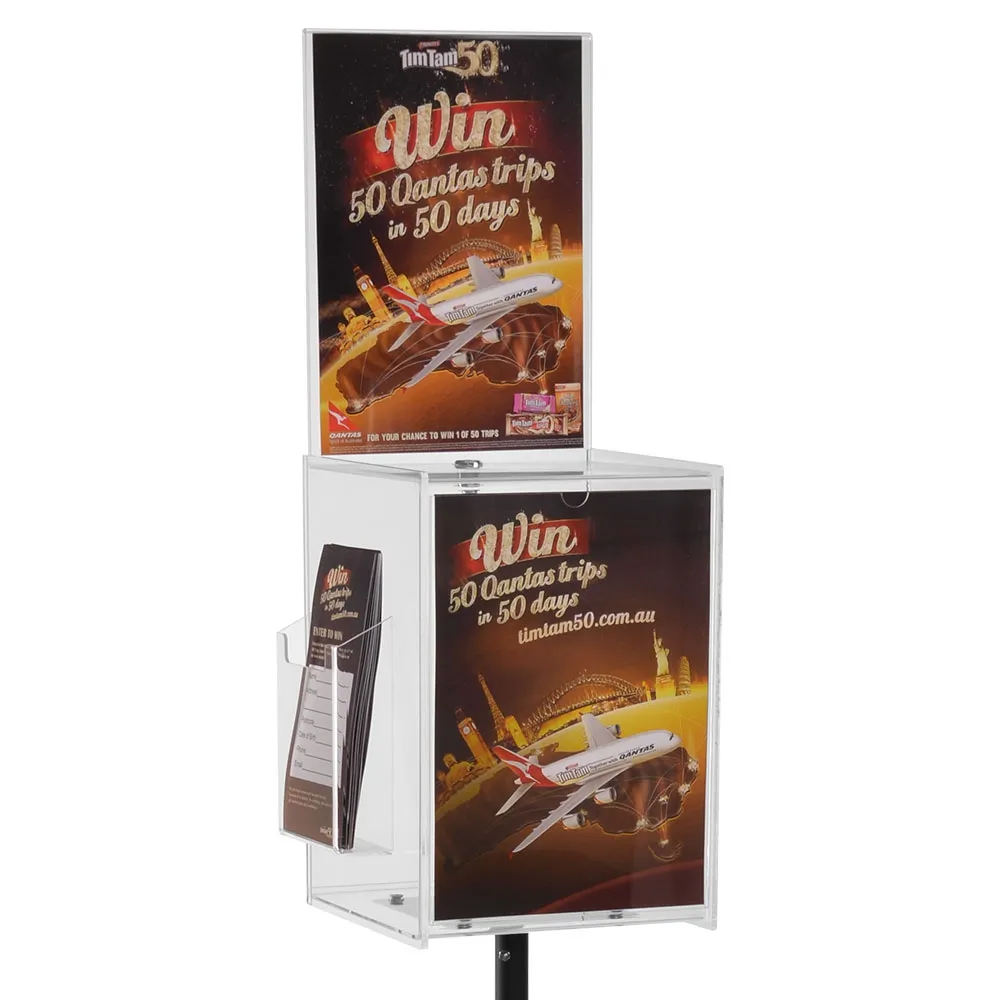 To help promote and inform what the box is used for, there are two poster holders on the display that hold A4 (210 x 297mm) posters in portrait orientation. One of the holders is on top of the box, and the other is on the front, with both featuring a slide-in design to easily change out graphics. This particular suggestion box has a clear acrylic pocket affixed to the side to hold suggestion cards up to 123mm wide, including DL (99 x 210mm) sized items! To complete the floor stand, a centre pole and base made out of black aluminium ensure a durable and lightweight display at an affordable price. The base of the stand is weighted for stability and has a rubber coating to prevent damage. Order by 3pm EST to receive same day despatch to anywhere in Australia with most in stock orders!