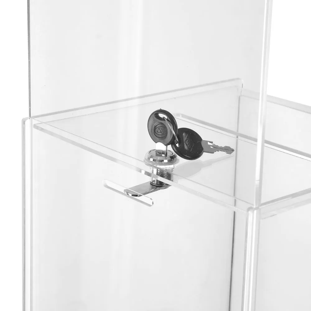 The comment boxes with lock, like many of our acrylic suggestion box options, are a lockable display to help prevent tampering or theft with the case contents. A sliding back door is easily accessible for keyholders to gain entry to the interior of the box. The box itself is made from 5mm thick clear acrylic to offer full view of the interior, helping to entice visitors to donate or leave a suggestion as they see others have already done the same.