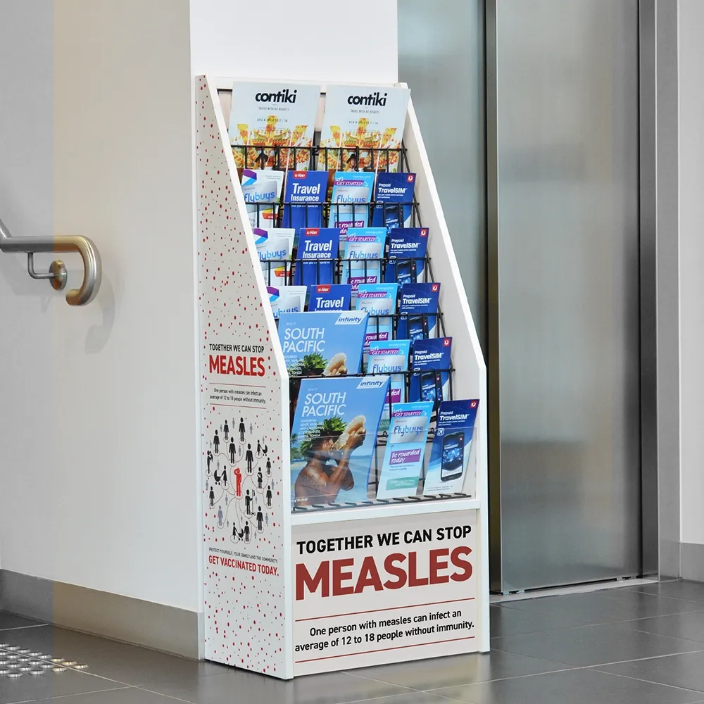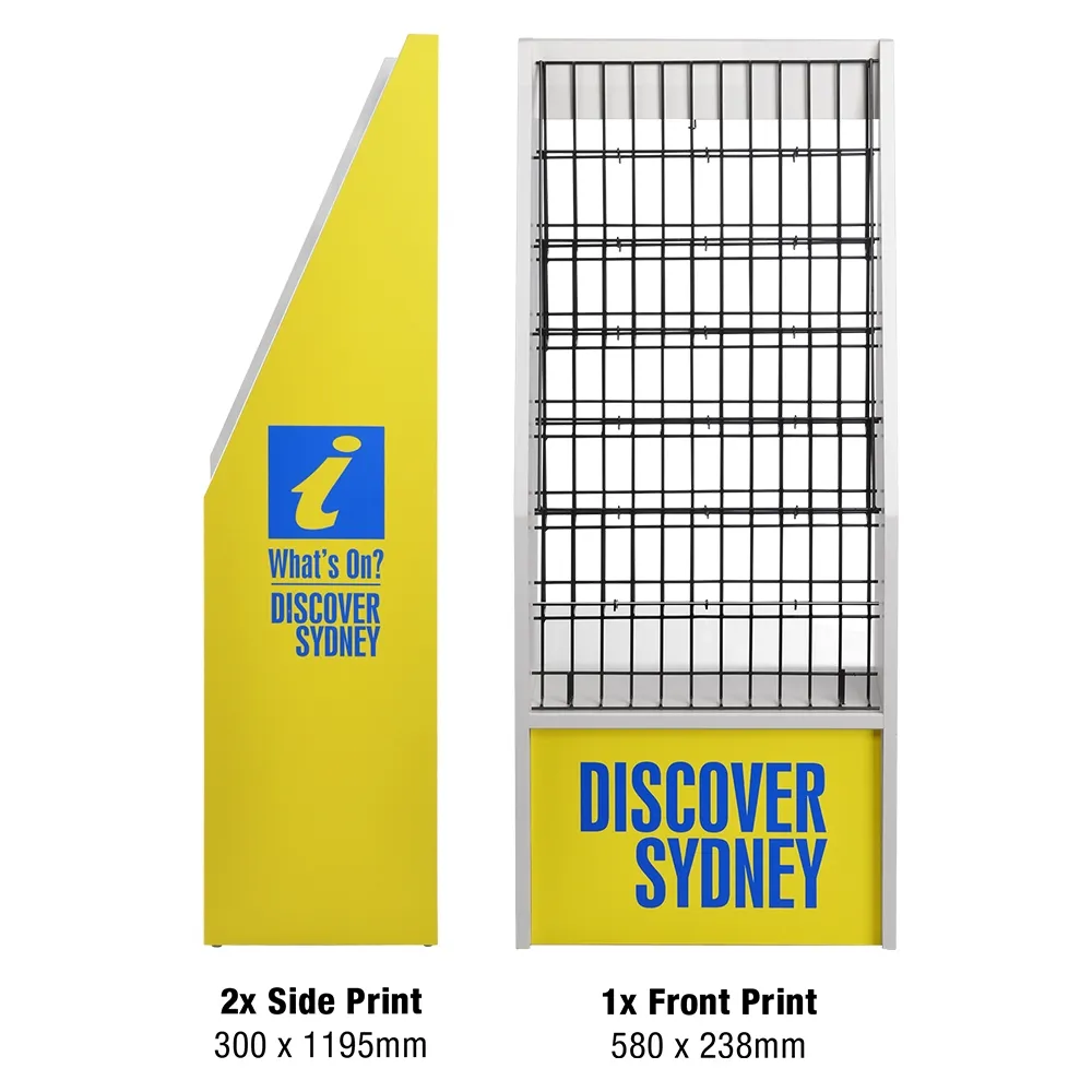 - Literature floor display rack features custom printing on 3 sides for easy promotion!