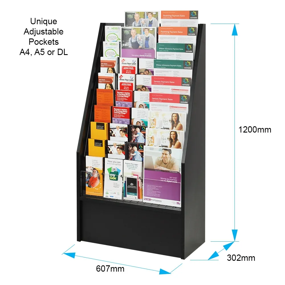 - Large stand is designed to hold (18) x A4 (210 x 297mm), (27) x A5 (148 x 210mm) or (45) x DL (210 x 99mm) flyers & catalogues