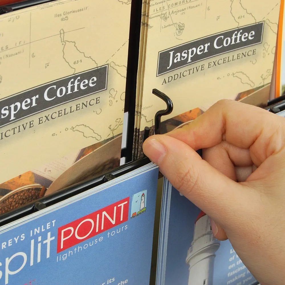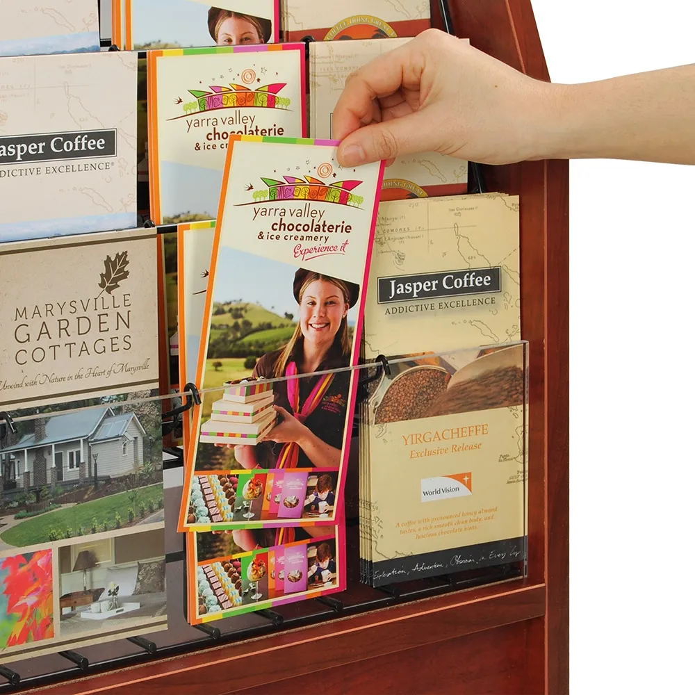 - Tiered display holds many brochures, all visible for easy browsing to find desired brochures