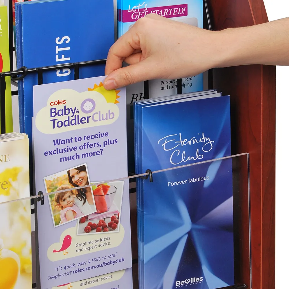 - Holder features tiered design so all catalogues & magazines are seen for passersby to choose from