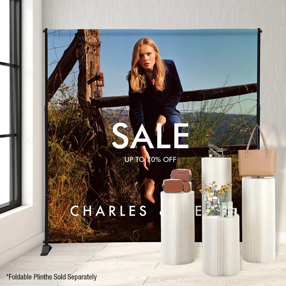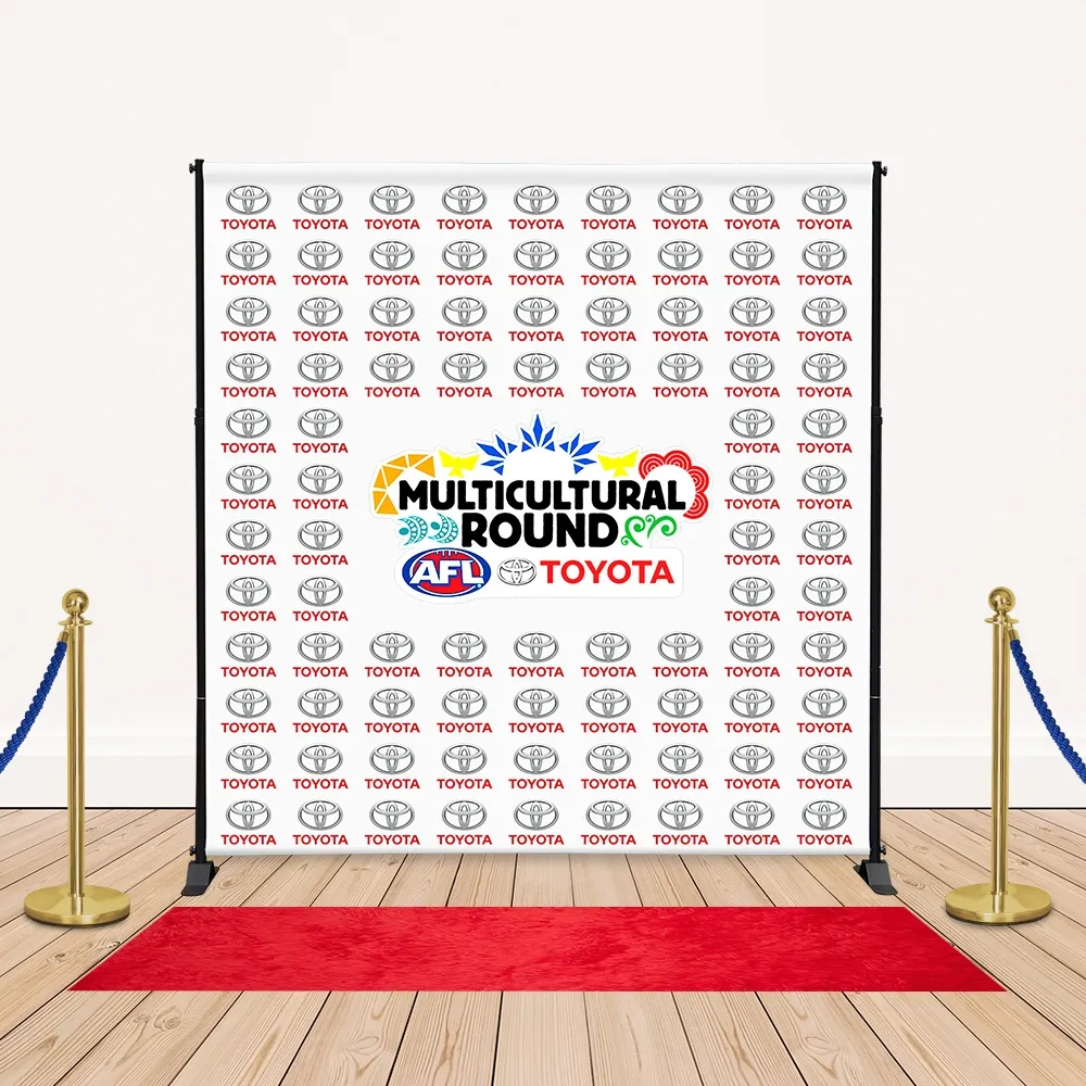 • Huge 2.4 x 2.4m banner has digitally printed custom graphics for exhibitions or red carpet events