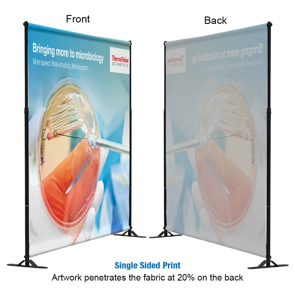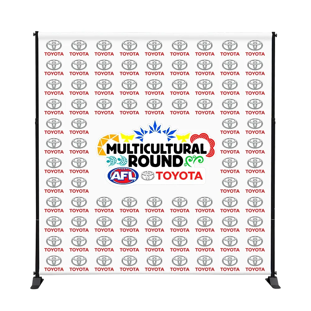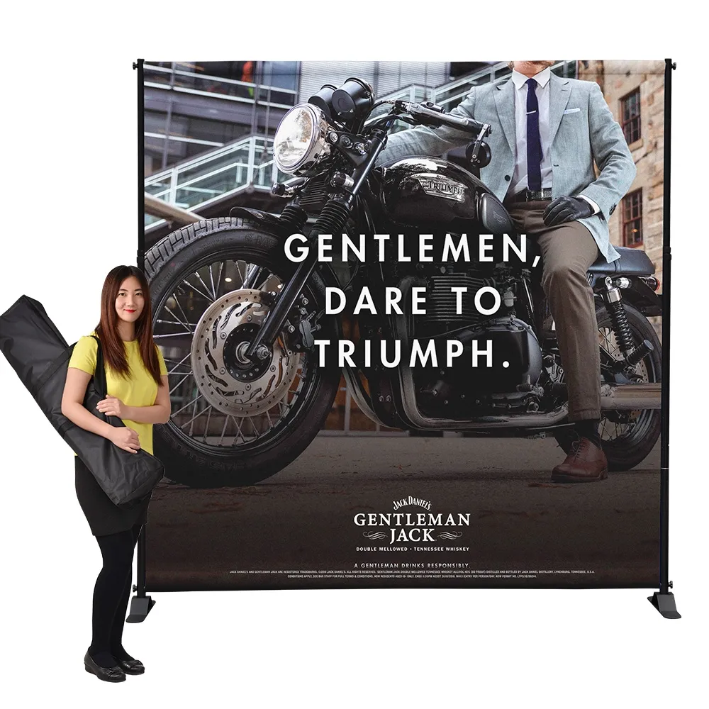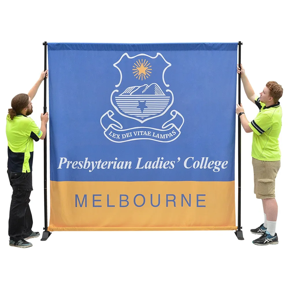 The custom fabric banner, printed backdrop uses steel poles that are powder-coated black, ensuring long-lasting use with a stylish look that helps focus attention on the graphic itself. Telescopic poles allow banners of different sizes to be used as well, making this versatile display a must have for your marketing purposes. Banner sizes range from 2..4 x 2.4m to 3 x 3m. Assembly of the entire display requires no additional tools, with total set-up time taking only minutes to allow focus to be put on other tasks.