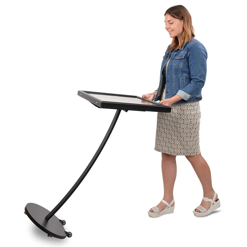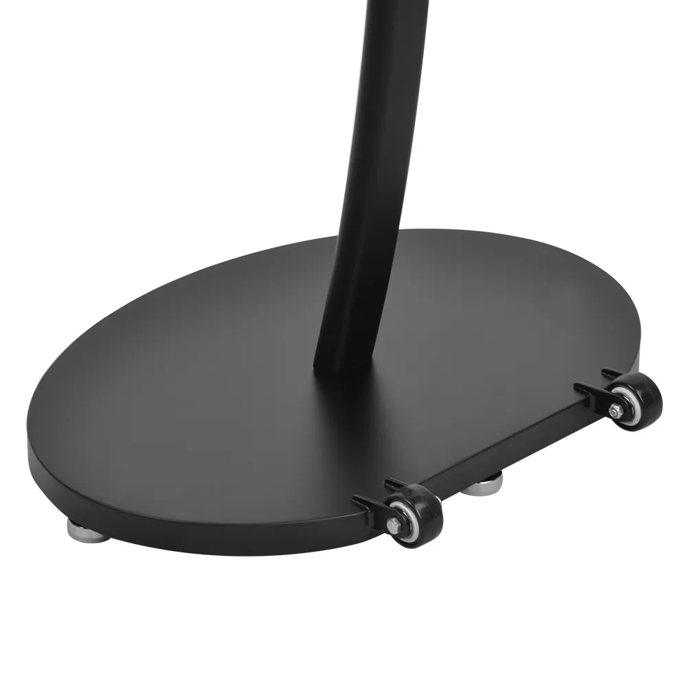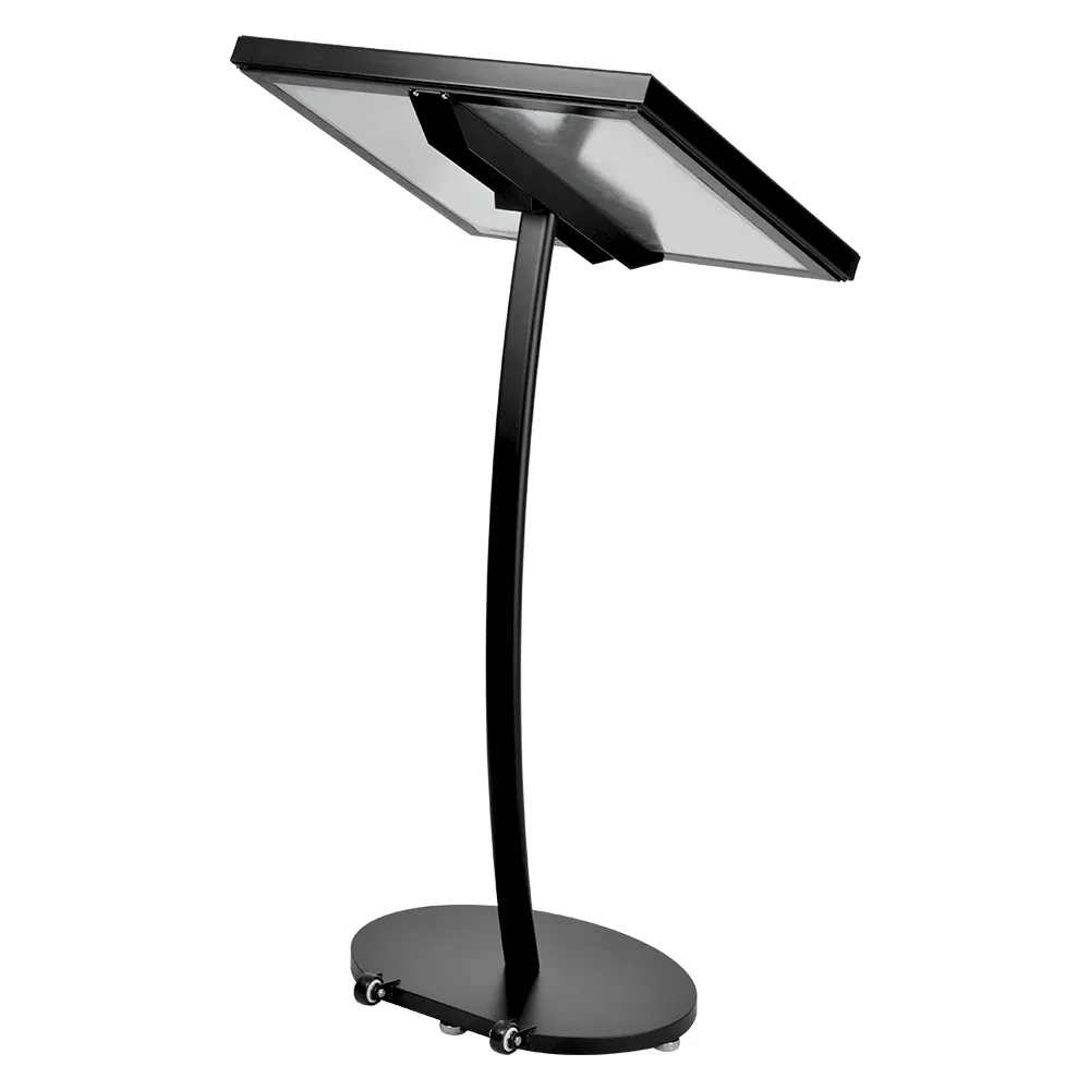 This stand uses a wheeled base that makes it easy to roll the 10.36kg unit into place by tilting the unit and pushing it along. The base is 300 x 500mm and features feet to ensure overall stability. An aluminium build with a black finish offers a sleek look that holds up well over time. The case is angled to make it easier to see posters atop the 1245mm tall unit.