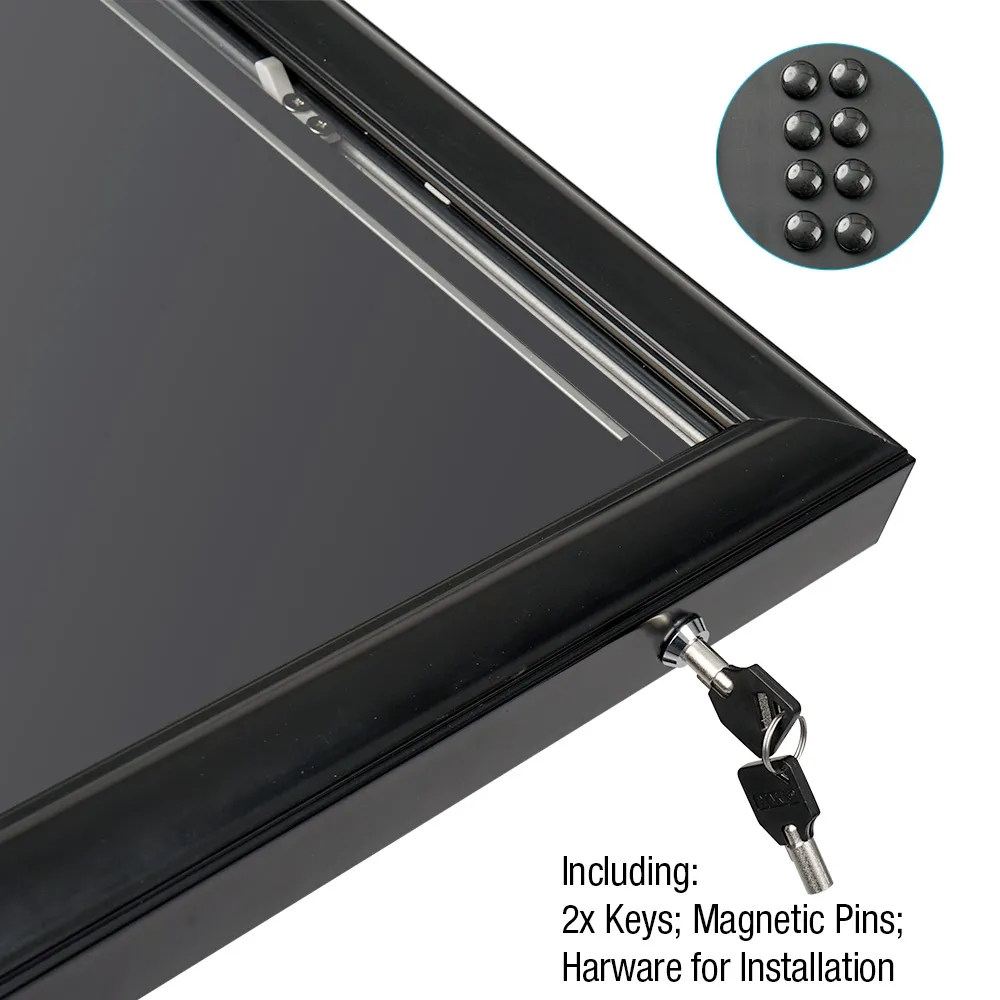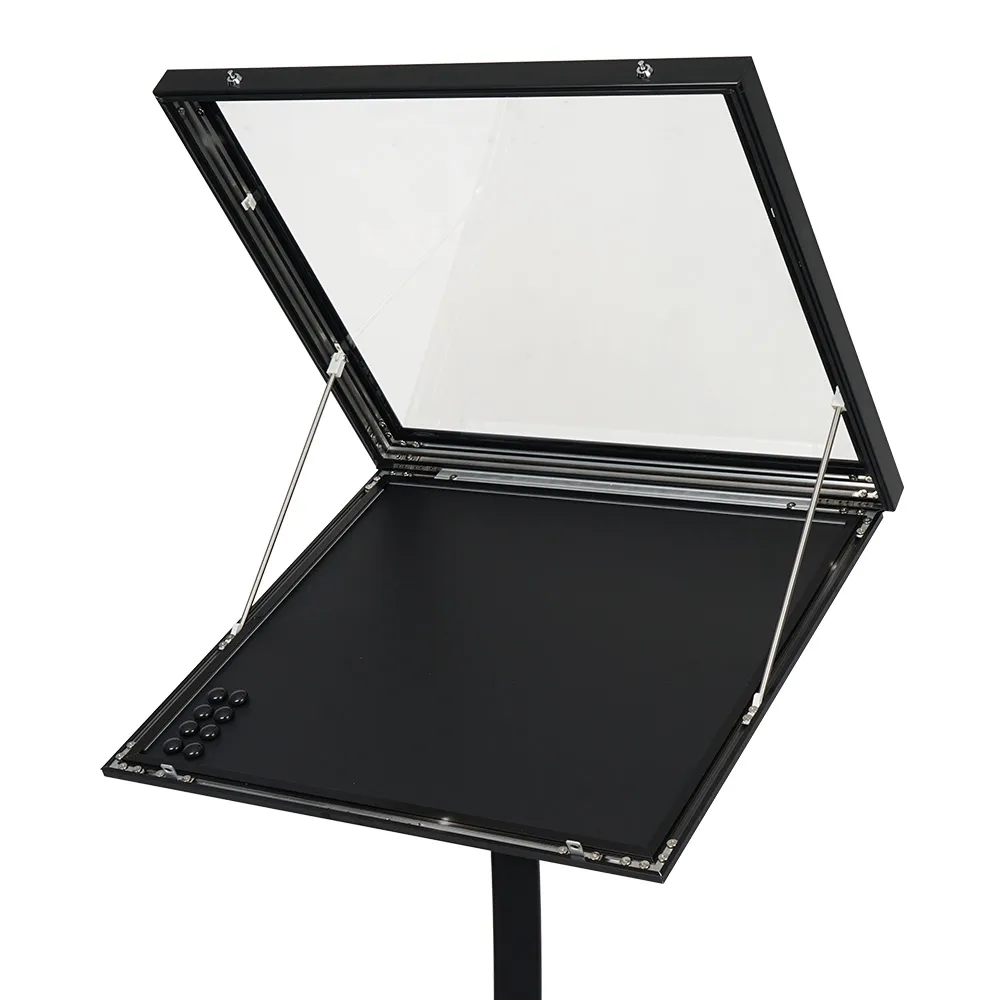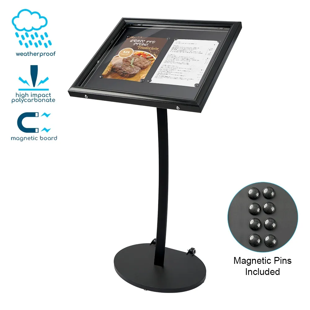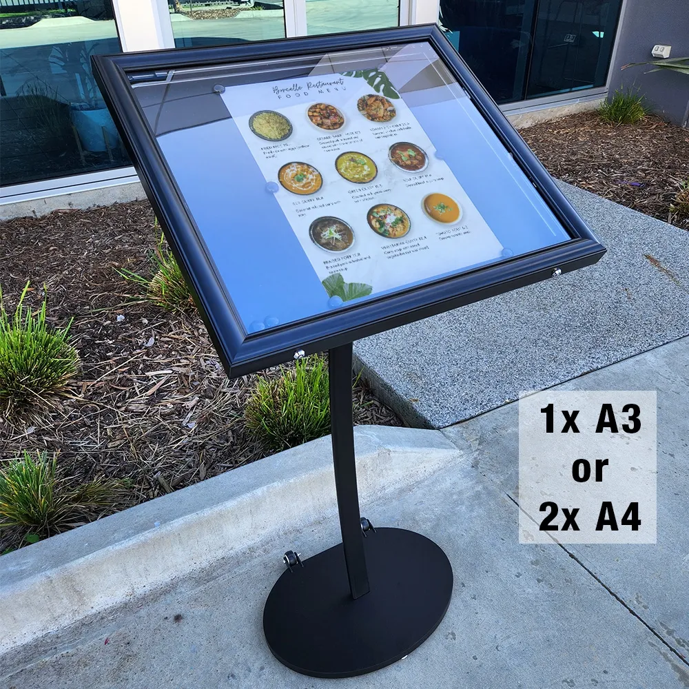 These outdoor A4 sign holders are perfect for placement outside of restaurants, cafes, information centres, and more to provide helpful information or display menus to passersby. The menu stand for outside is designed to display (2) A4 (210 x 297mm) or a single A3 (297 x 420mm) graphic within the display case. Any orientation is possible, and other sizes of signage can also be used within the 510 x 447mm visible area. This display uses a magnetic backing that makes positioning graphics simple and quick. There are (8) black magnets included as well for easily placing signage in seconds.