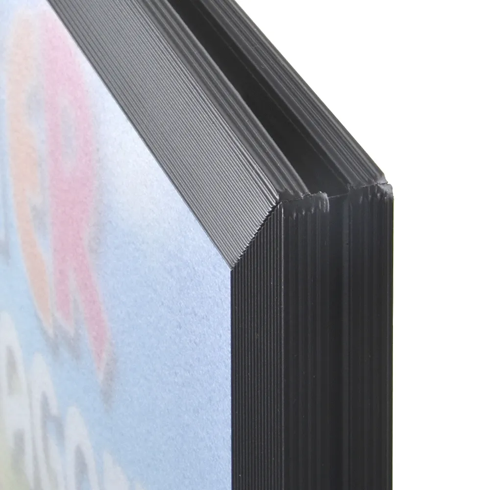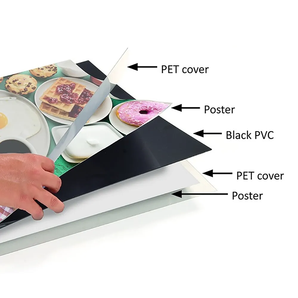 The poster frame has a slot in the top edge into which posters are simply dropped or removed. This means that change the posters in your display is quick and easy. The poster stand also comes with glare resistant plastic lens to protect your graphics.