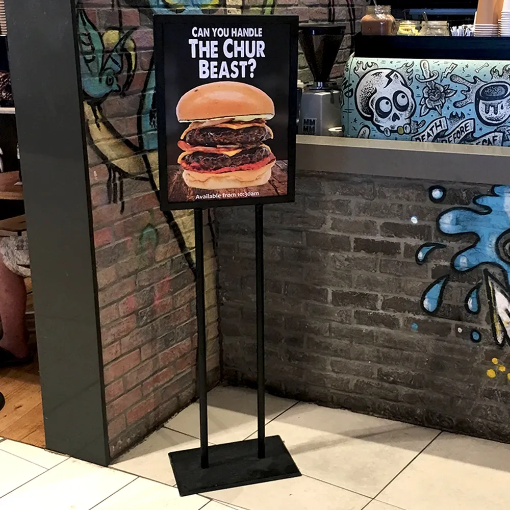 This budget Poster Stand model is a cheap way to display advertising, menus, directories and branding. The dual supports of its aluminium construction ensure a robust and stable presentation and display your poster clearly to passing foot traffic.