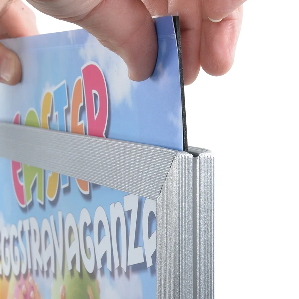 - Poster slides into a slot in the top of the sign