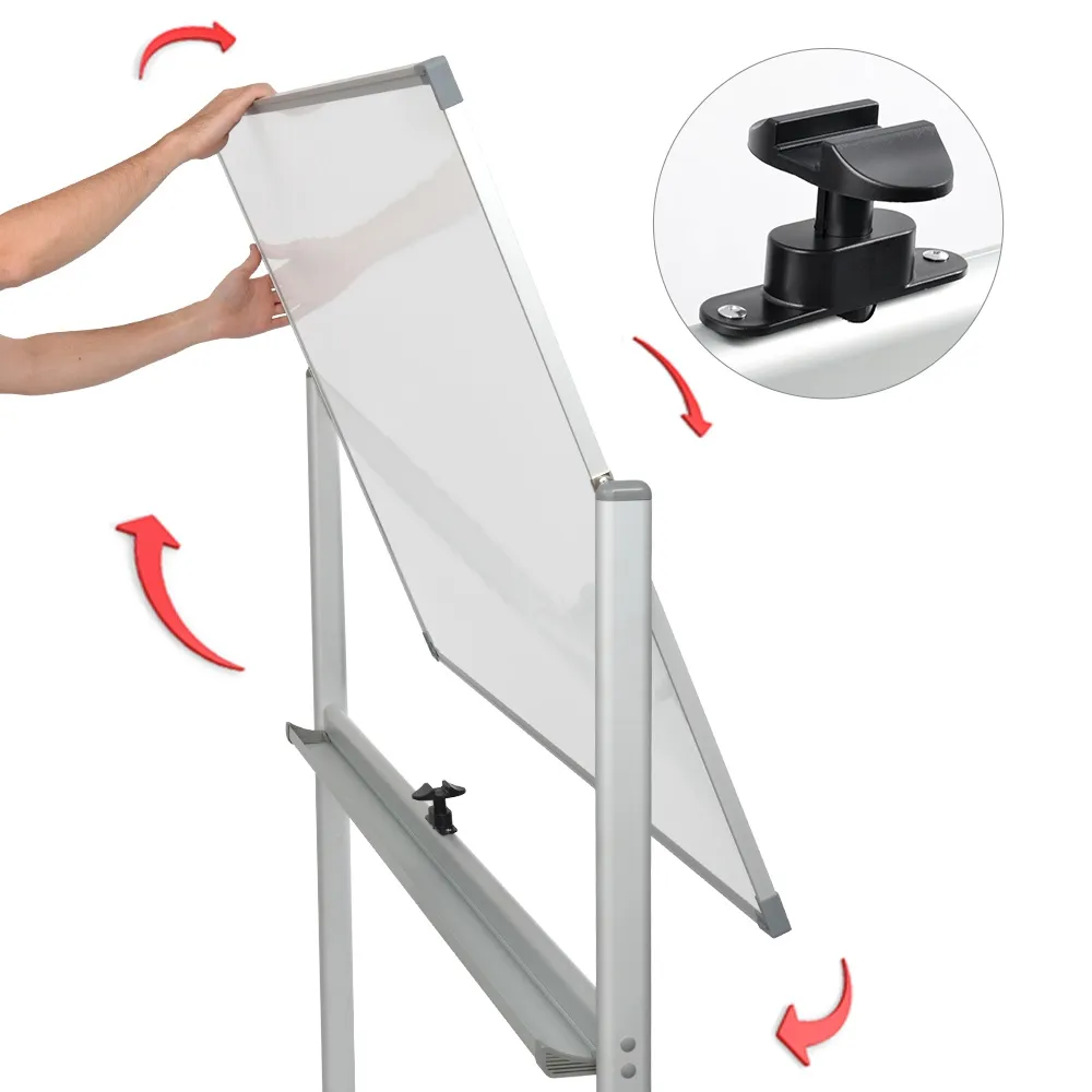 This mobile markerboard uses a large white board to make presenting to an audience of visitors or students easy! The dual-sided whiteboard is 900 x 1500mm and features a 70% to 80% gloss finish that looks great and is easy to erase, a top quality display at a great price. There is a white board on each side of the display, with a spring-loaded clip on the stand making it easy to switch between sides in seconds. This allows writings to be preserved if necessary when needing to provide more information. The dry erase board is magnetic as well to allow notices and posters to be attached with ease.