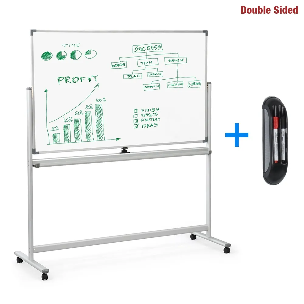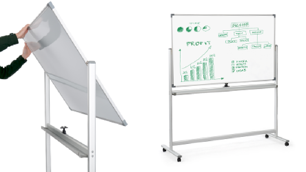- Mobile markerboard has dual-sided board with spring-loaded clip for easy change overs