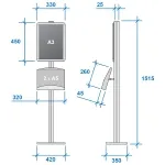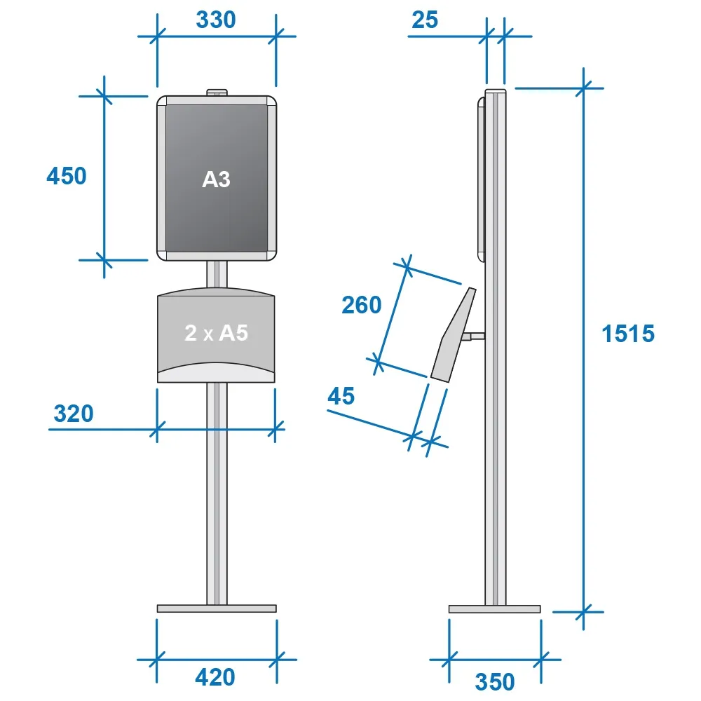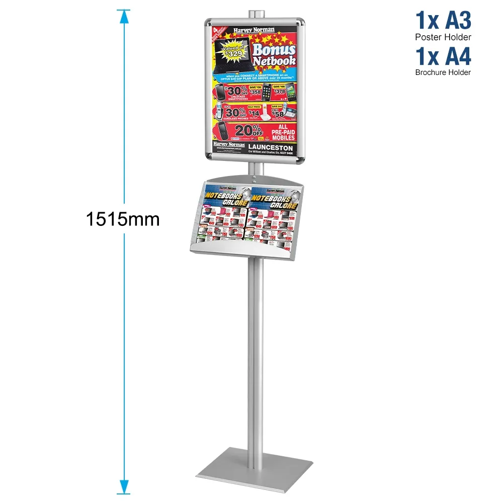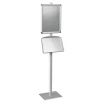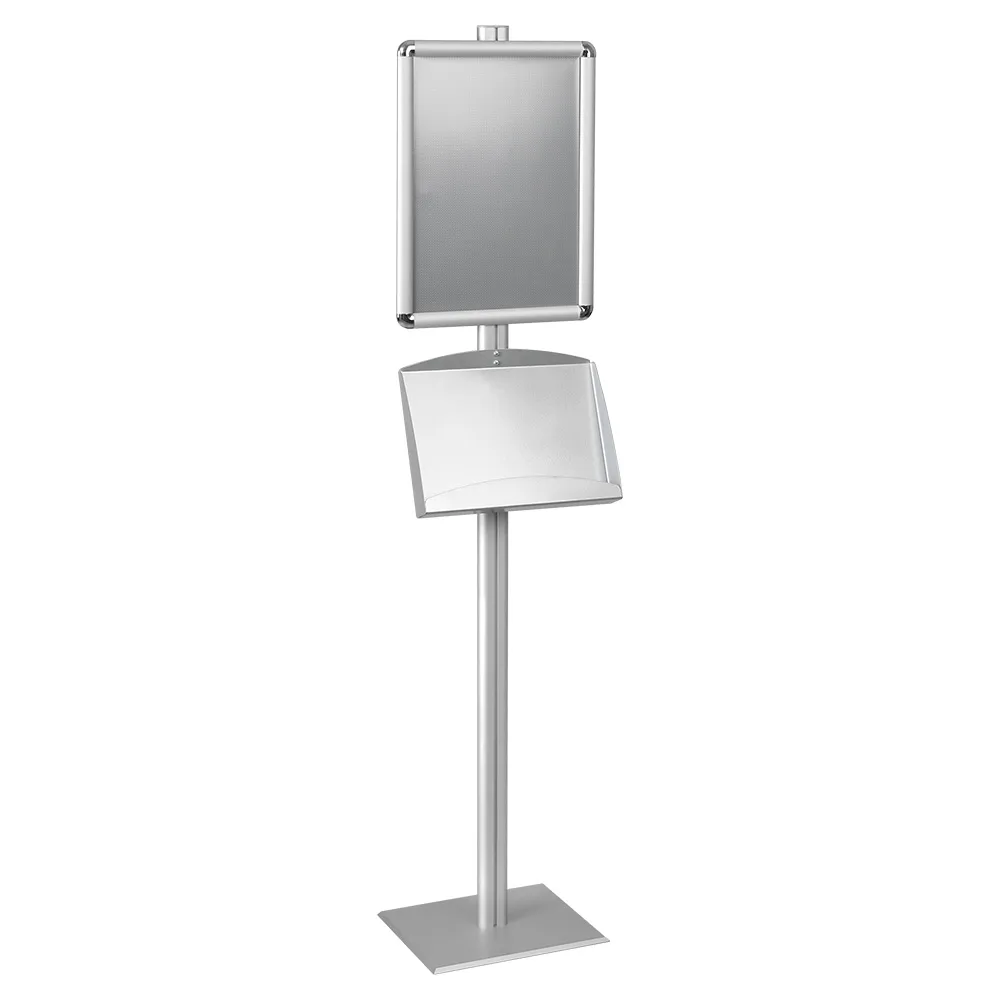 The ad display lures customers in using a graphic frame, and then provides additional information for potential clients to learn more. The brochure post features (2) brochure shelves that hold A5 standard sized pamphlets. This catalogue rack, ad display also features an A3 sized snap frame to hold custom graphics. The snap frame can be attached to the stand in either portrait or landscape orientation. The ad display uses snap frames to allow for quick graphic changes, requiring no tools with the simple design of the frame. An included protective lens ensures the graphics stay clean and help prevent vandalism.
