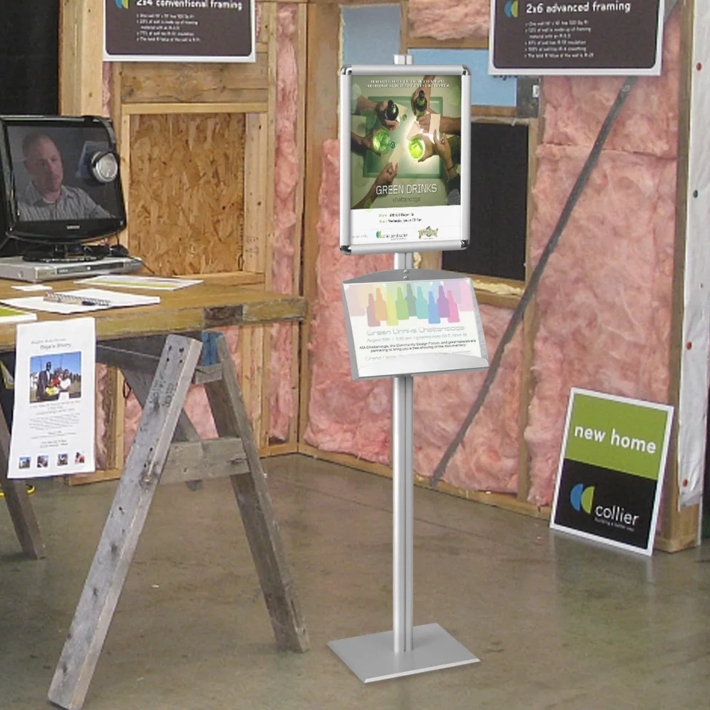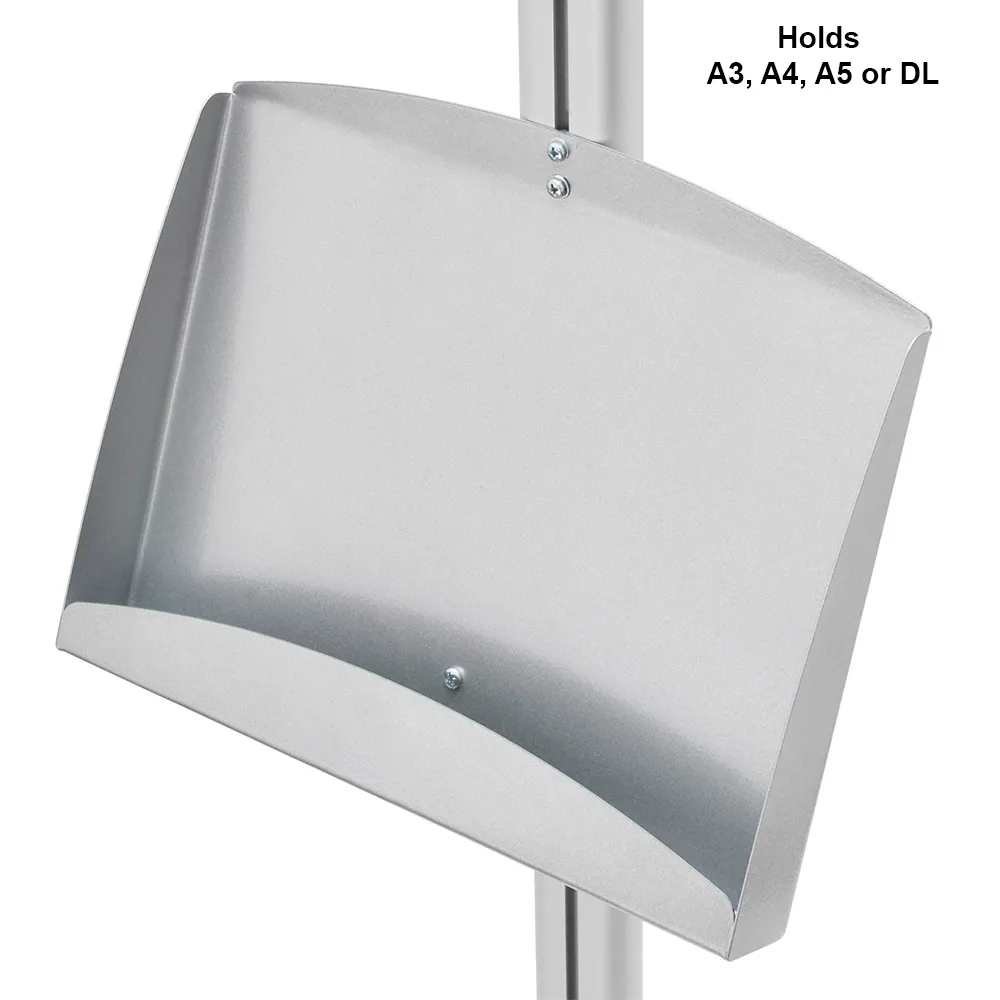 This ad display, like a brochure post or portable catalogue stand, are used in exhibition centres, car dealerships, information centres, retail stores and office lobbies. The versatile units are easily portable, but remain stable once in place due to the plate steel within the stand. An ad display includes all the necessary hardware for installation and the tools to assemble the unit, which only requires a few minutes. The components of the stand are modular, so they can be moved up and down the stand into desired positions.