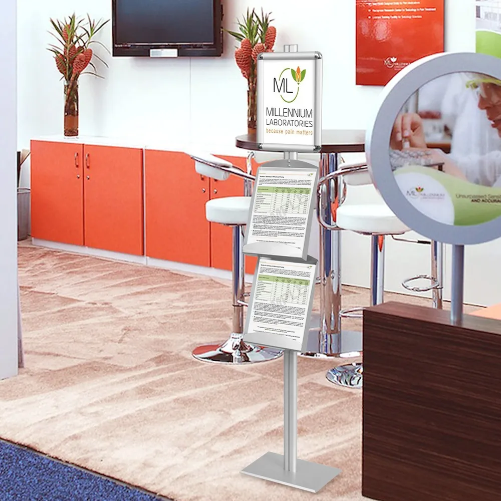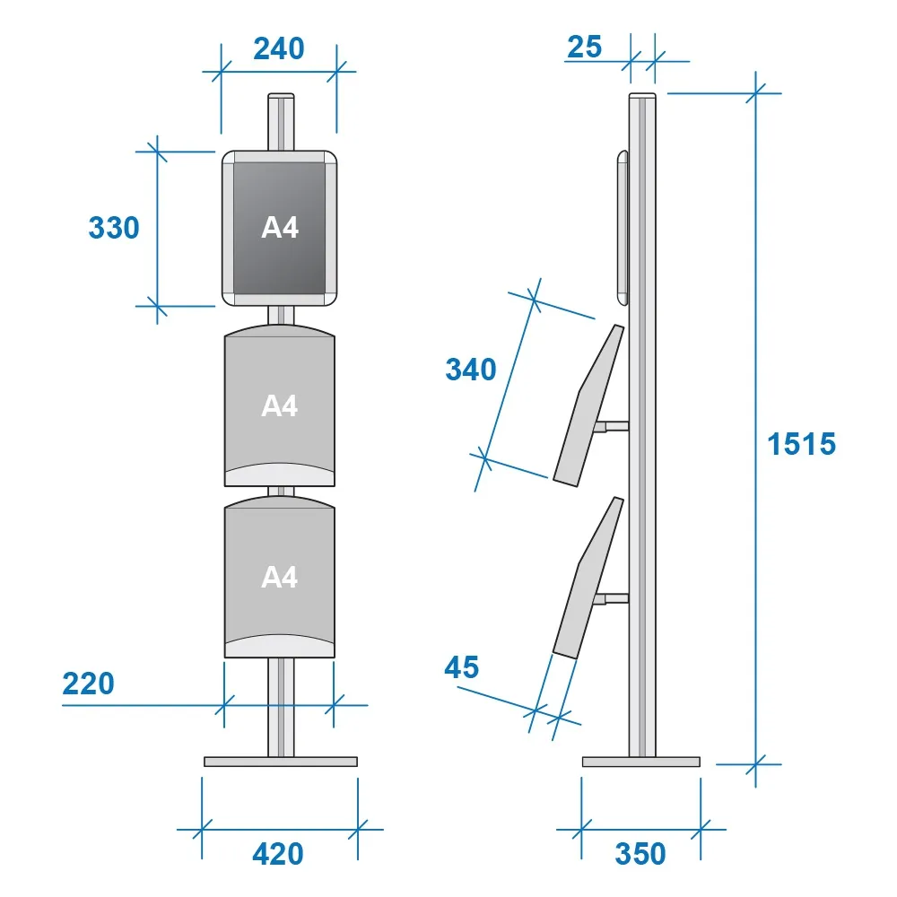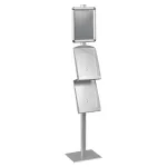 Trade show signs, literature holders, and other exhibition brochure stands also have an A4 snap frame to hold customer graphics. This snap frame can be placed in landscape or portrait orientation, and includes protective lenses. Exhibition brochure stands use these lenses to keep graphics free of grime, and dust, while also helping to prevent vandalism. Changing graphics out only takes 60 seconds with no tools required! The trade show signs are made from aluminium for durability, and the plate steel base ensure stability even in heavily trafficked areas. The catalogue display includes all necessary hardware and tools for set-up, which only takes a few minutes!