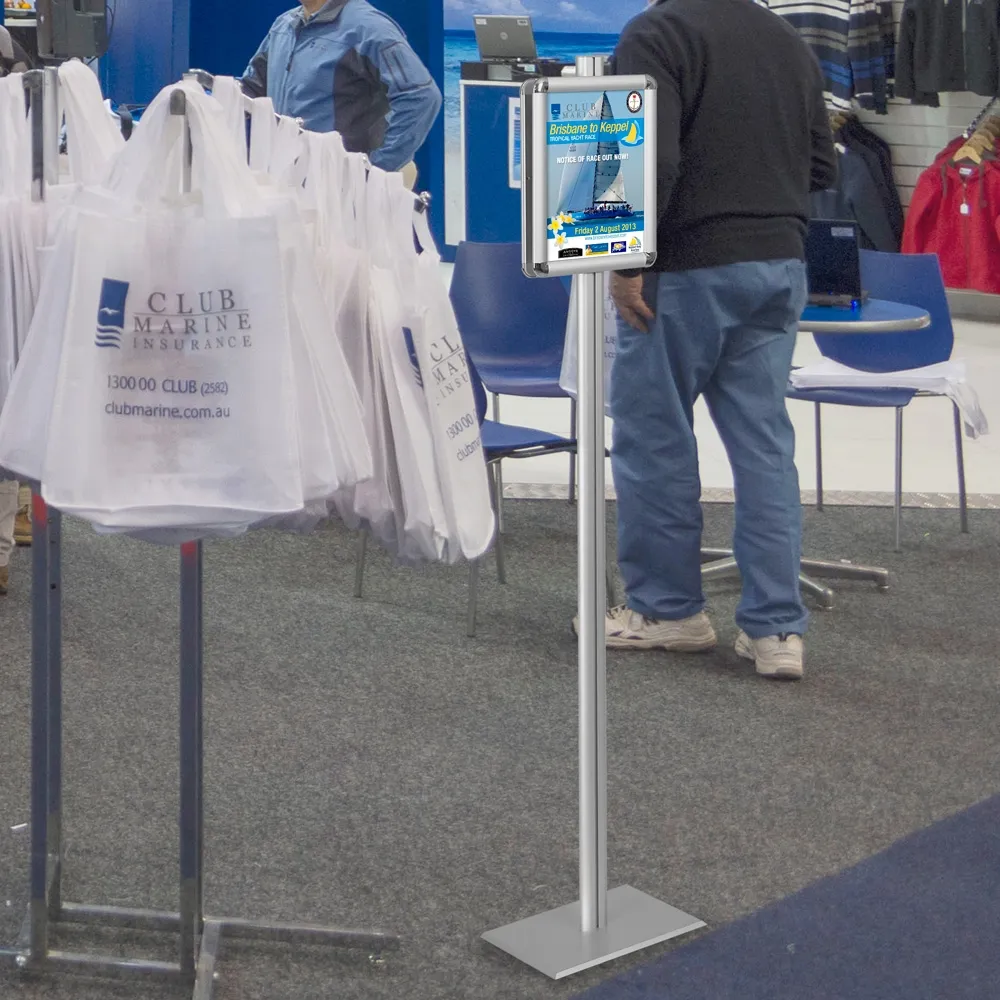 The poster display allows the snap frames to easily be placed anywhere along the pole. There are many more components that may be purchased as well that allow you to customise these displays to best suit your needs. The magazine stand is a portable unit that can be moved around a floor easily. The base of the poster signs is made from plate steel to stabilise the unit once in place.