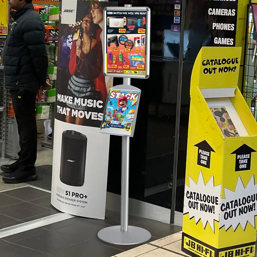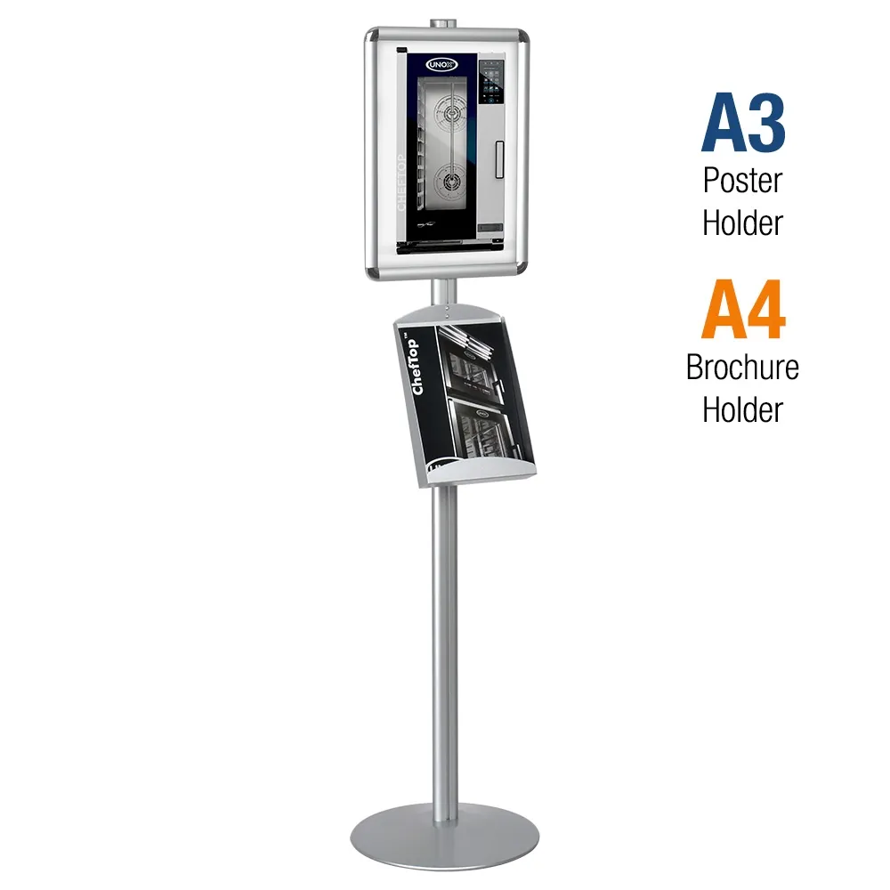 An A4 information stand, like floor standing brochure displays, also has a poster frame included that helps draw attention towards the display. This frame is designed to hold A3 (297 x 420mm) standard sized posters that offer plenty of space for large fonts and eye-catching graphics. The versatile snap frames can be attached to the freestanding display in portrait or landscape orientation depending on your style. A protective lens is included as well that helps keep displayed items free of grime or dust whilst in use. Snapframes requires no tools for quick graphic changes, making them perfect for fast-paced environments.