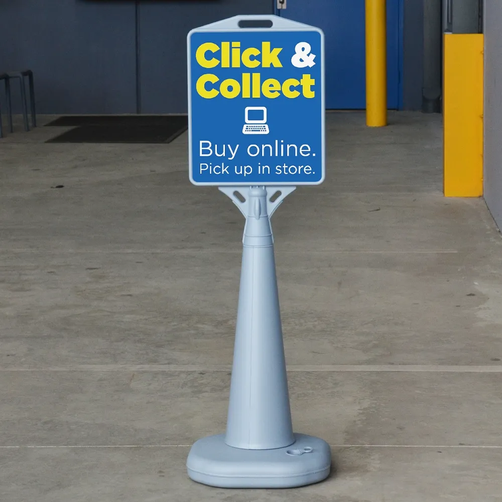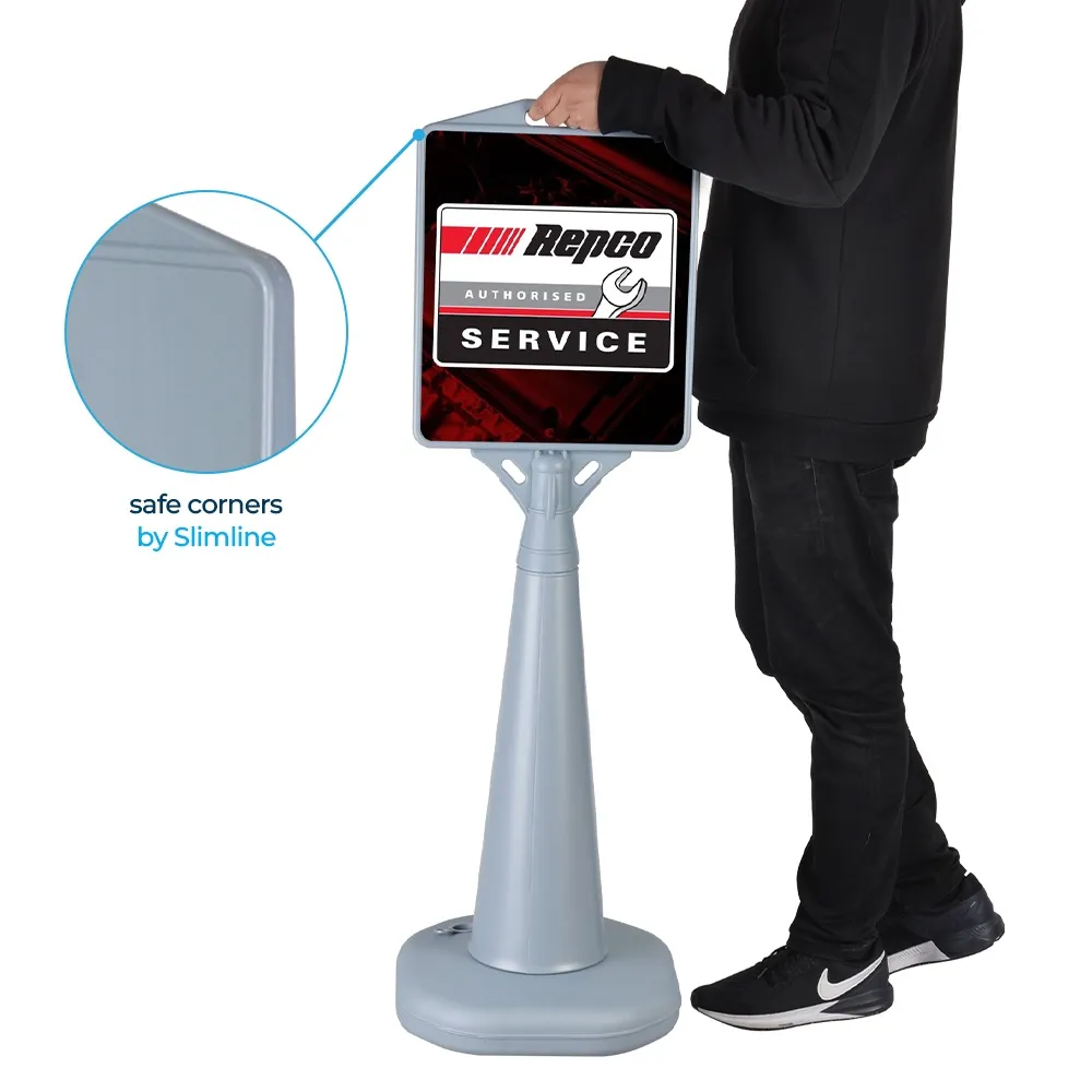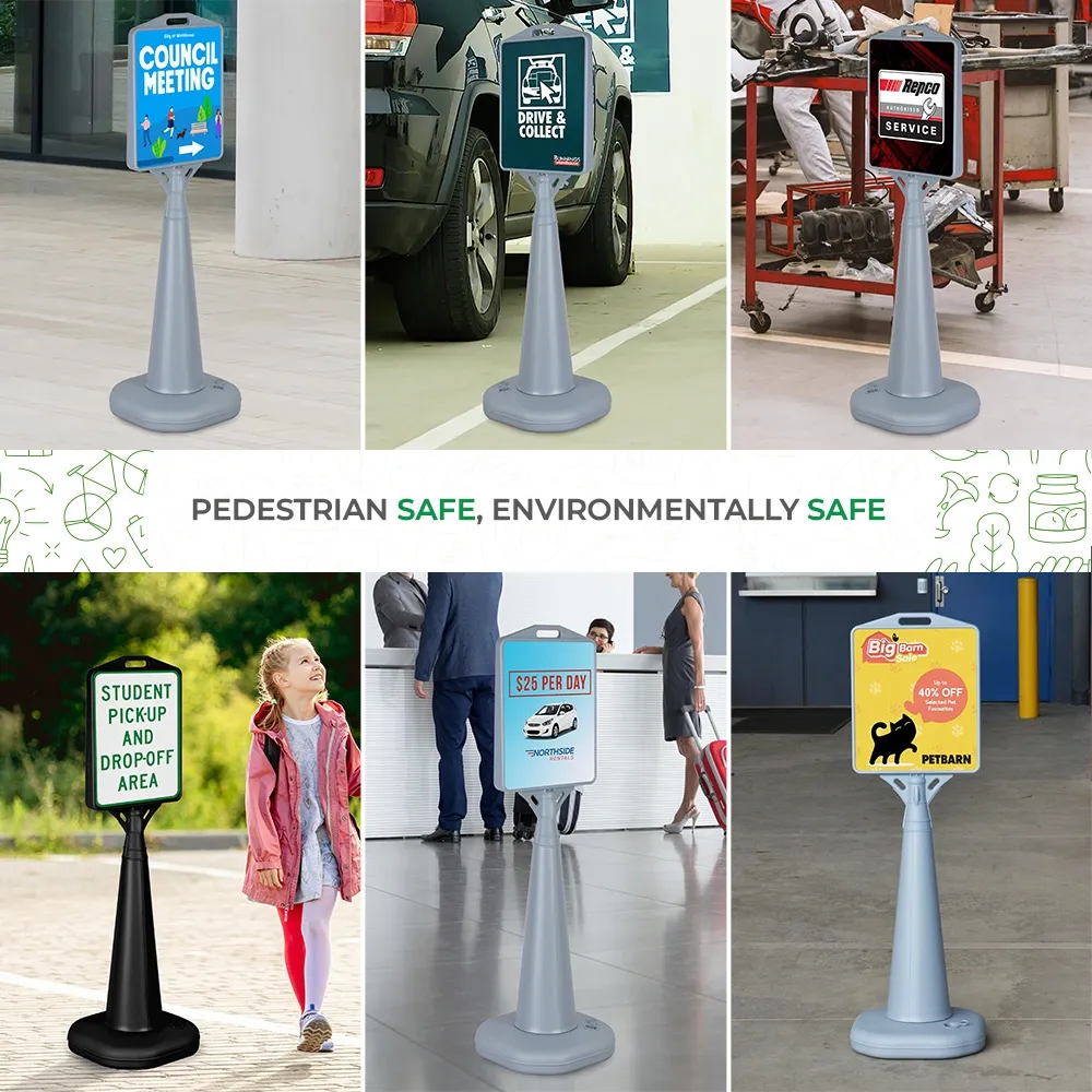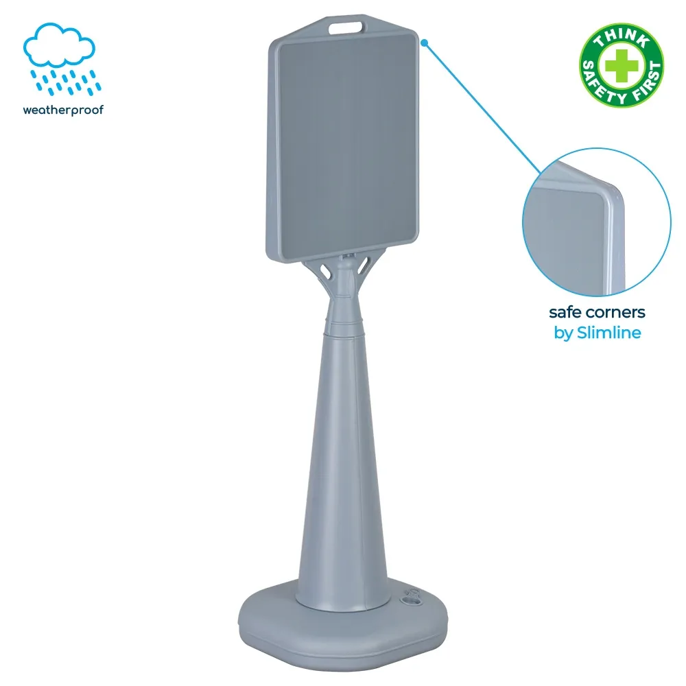 It is a double-sided freestanding sign that features a ballast base that can be filled with water to prevent it from being knocked over and has a moulded carry handle at the top making it an easily portable sign.