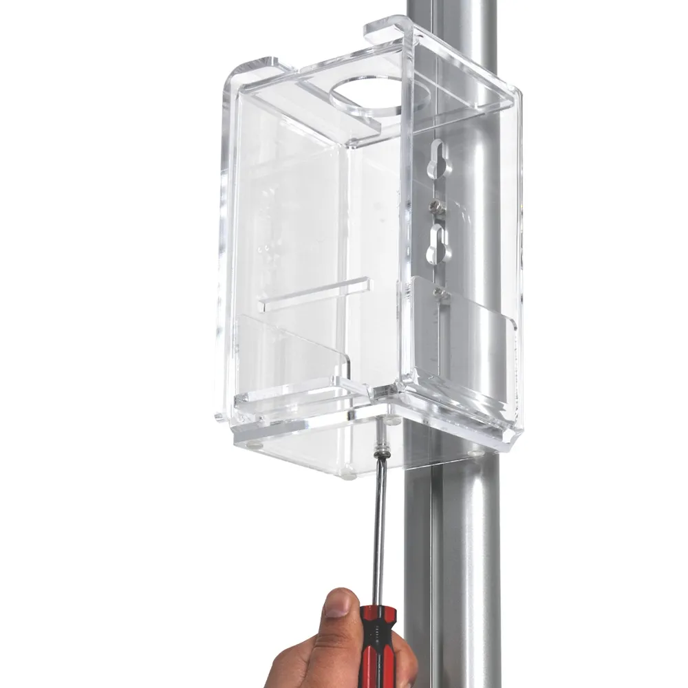 Use this free standing hand sanitizer dispenser to easily designate where visitors or employees in your location can cleanse their hands! These sanitising stations effectively help to prevent the spread of coronavirus by using the clear acrylic holder to provide sanitising gels to customers to keep their hands germ-free. The adjustable height container is able to hold 250ml or 500ml sizes without issue using an easily inserted shelf made of the same 5mm thick clear acrylic with polished edges! The entire holder can be placed where desired along the centre pole to best fit the needs of your clientele.