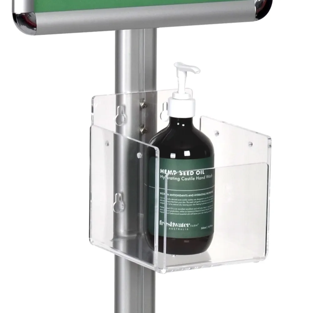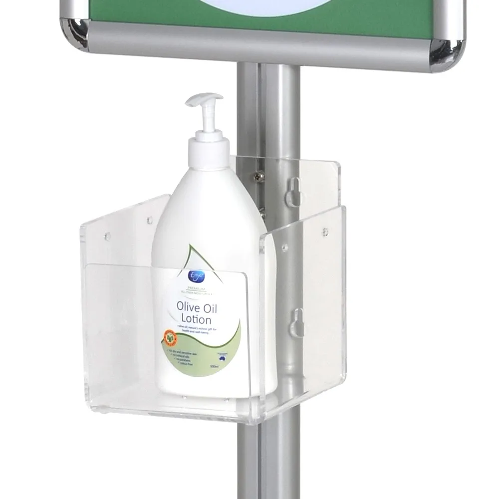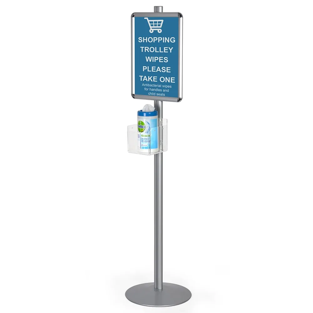 This floor stand hand sanitizer dispenser helps offices, shopping centres, universities, retail stores, information centres, and more to provide sanitising gel or wipes to help protect against the spread of germs. The sanitiser station has an open-top clear acrylic container that is designed to hold nearly any brand of sanitiser gel or anti-bacterial wipes to make it easy to provide customers with a place to wipe down trolleys or cleanse their hands. The 138 x 154mm bottom holds most sizes without issue, including 250ml and 500ml bottles of gels!