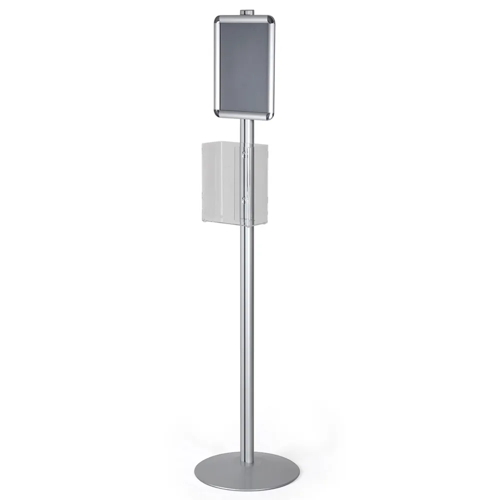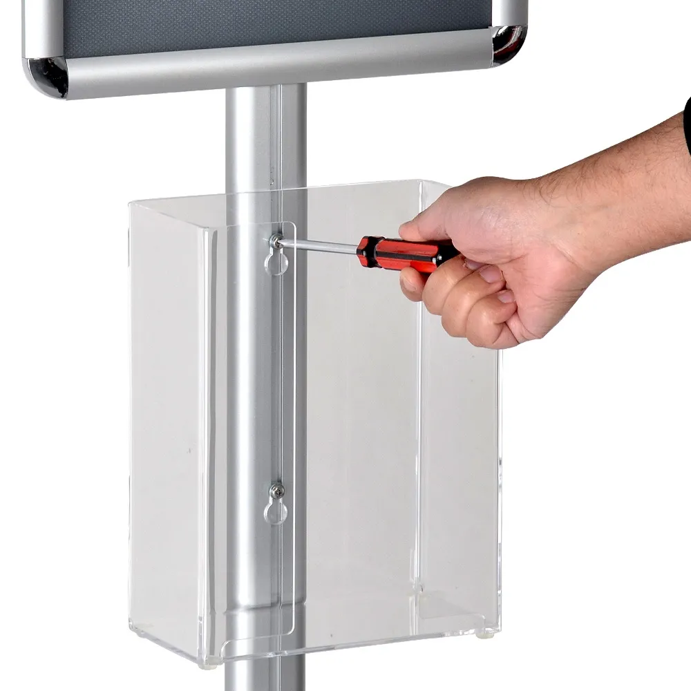 A mask dispenser stand, part of our line of business support essentials, has a poster holder included as well to help identify the station. The snap frame is designed to display A4 (210 x 297mm) posters in portrait orientation. Clip frames make it easy to change signage out with no tools needed and have a protective lens included that prevents grime or dust build-up on posters whilst making them easier to read. The acrylic container and poster frame can be placed anywhere along the centre pole, with additional accessories available to fully customise this display!