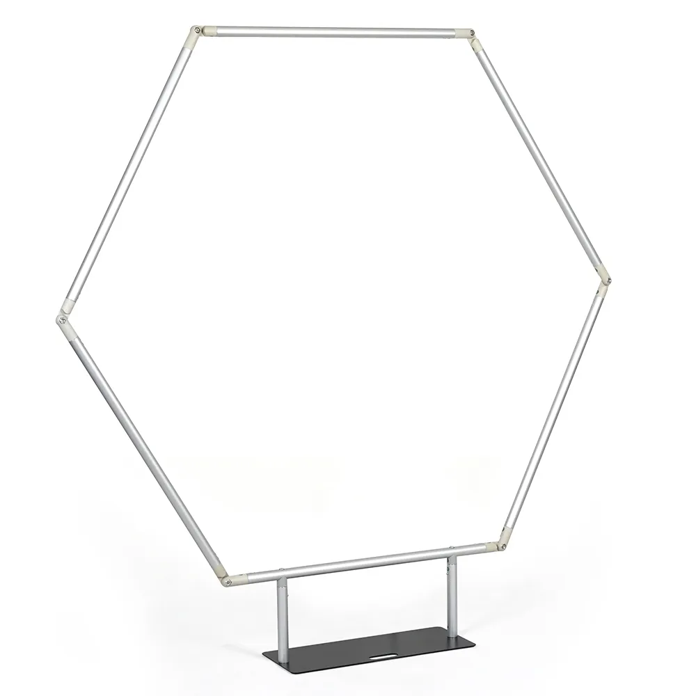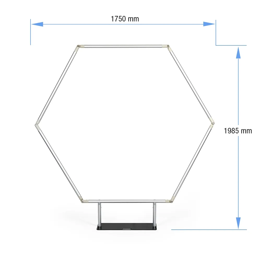 This hexagon backdrop stand is a large 1750 x 1980mm unit that is great for using as a photo shoot back drop, greet people as they enter events, or even as a advertising display at retail stores! The exhibition display can have a custom printed fabric wrap (sold separately) with your designs on it or have items such as balloons wrapped around the unit to create an eye-catching look. This style of back drop is popular at trade shows, weddings, expos, shopping centres, carnivals, and more!