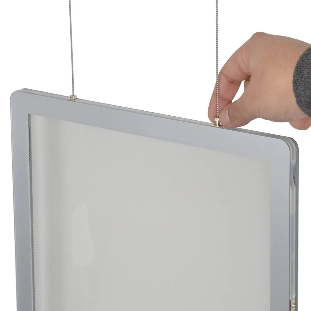 Cable for lightboxes is used to power LED poster frames directly from the rail, ensuring no unsightly cables are shown to maintain a professional appearance. There are two separate cables included with this set that are marked in blue and red to signify which is for positive and which is for negative. The simple screw in design requires no tools for installation on either the rail or the poster frame. While the poster frame has designated spots on the sides for attaching the cables, the top connection slides where needed along the rail. This allows you to position where you have your frame hanging down prior to tightening in place. These light box connection cables can be cut to size as well to accommodate different ceiling heights.