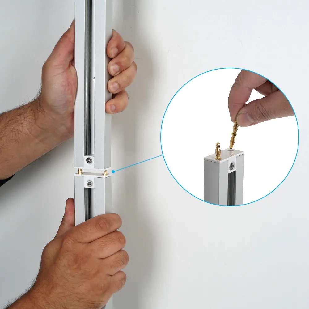 Lightbox rail connectors are used to put hanging rails for poster frames together to cover larger spans. The pins are made of brass to be long-lasting and properly connect the rails together. Brass is used to pass electricty between the rails to ensure all poster frames are powered without having to use additional power supplies. There are (4) individual pins included, with (2) pins needed to connect each rail together. The spring clip designs require no tools to tightly fit within the pre-drilled holes on each rail, simply push the sides together to secure the connection.
