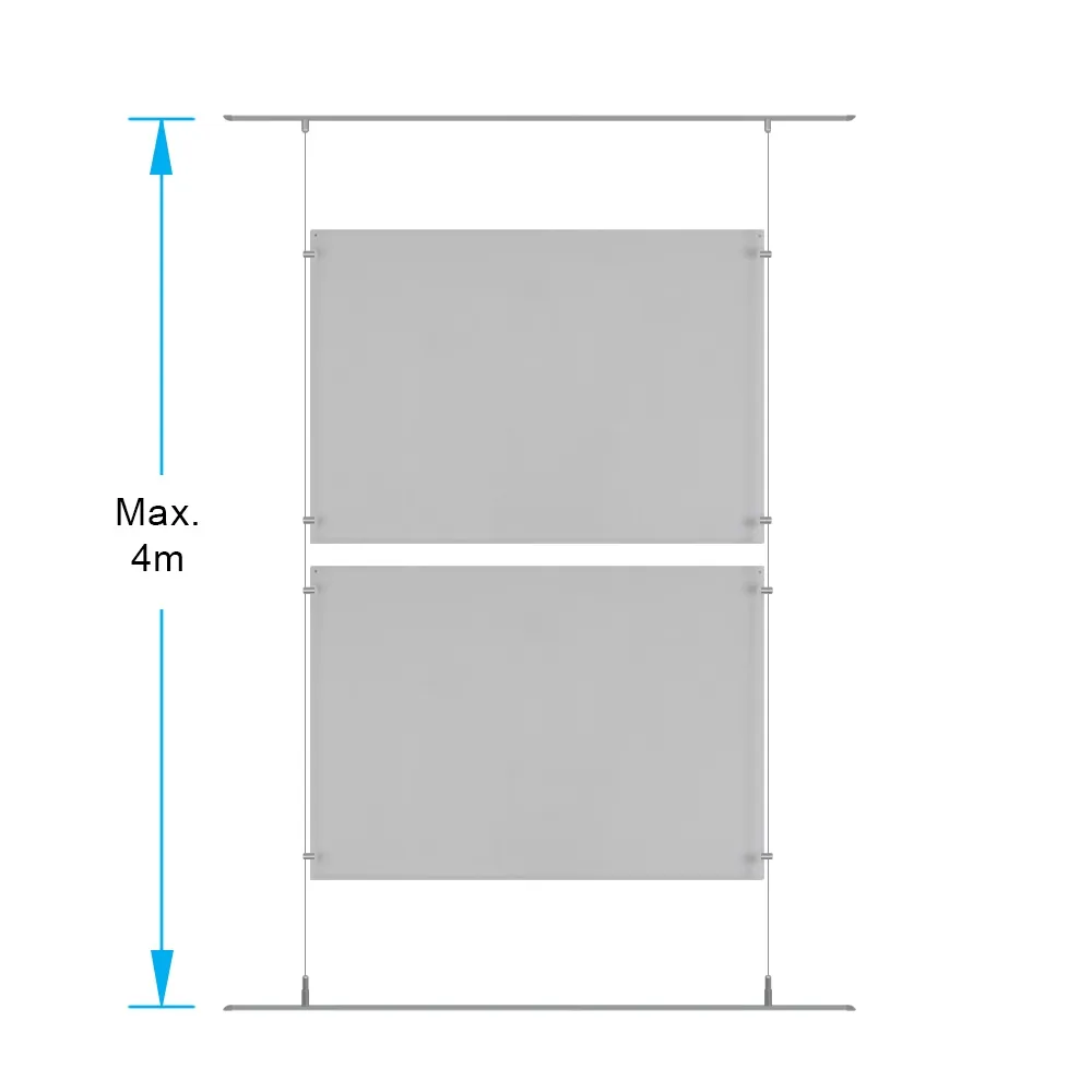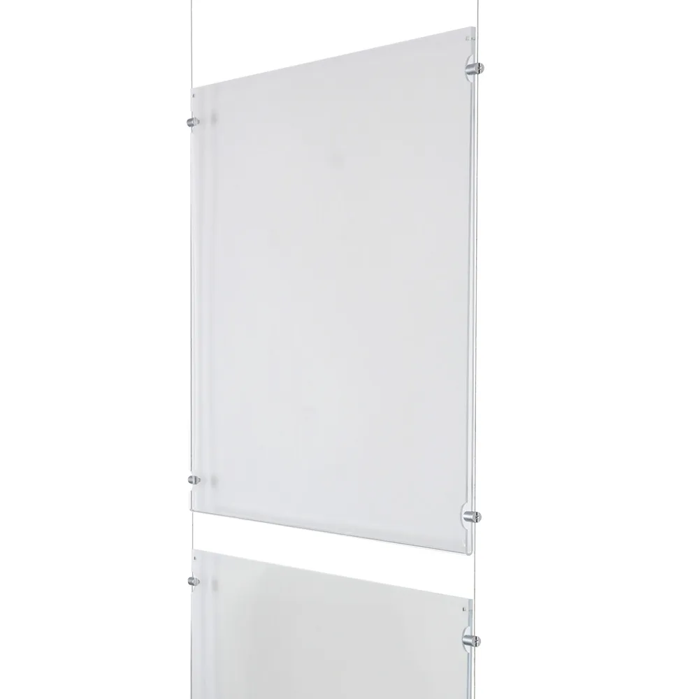 The cable hanging system, hanging window display has multiple configurations to choose from to allow your business to find the right fit, with the two pockets in a single column version available on this page. The pockets feature cut-outs that allow edge grip stand offs to attach the holders to the steel cable, creating a floating effect that is eye-catching in any location. Our new cable system features 1m long hanging rails that attach to the ceiling and floor, with fixings sliding into place that make installation and positioning much easier! The included steel cable is in 4m lengths and can be cut to size to fit nearly any location!