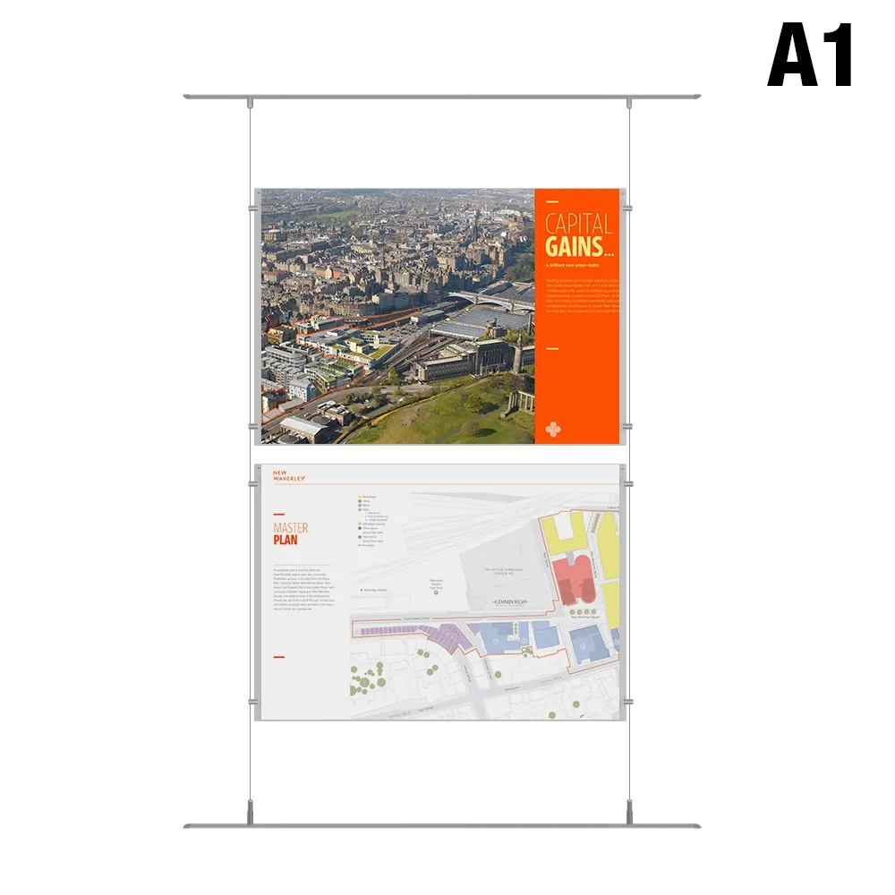 This hanging window display is great for real estate agencies, museums, retail stores, information centres, and more to display heaps of information in an eye-catching way! The A1 cable displays use dual-sided clear acrylic pockets to hold signage, with button magnets embedded within the 3mm thick perspex to help keep posters in place and the sides closed whilst in use. Each pocket is designed to hold A1 (594 x 841mm) posters in landscape orientation, displaying large graphics that are highly visible to get the attention of passersby with ease. A slide-in design allows graphics to be quickly and easily changed with no tools needed.