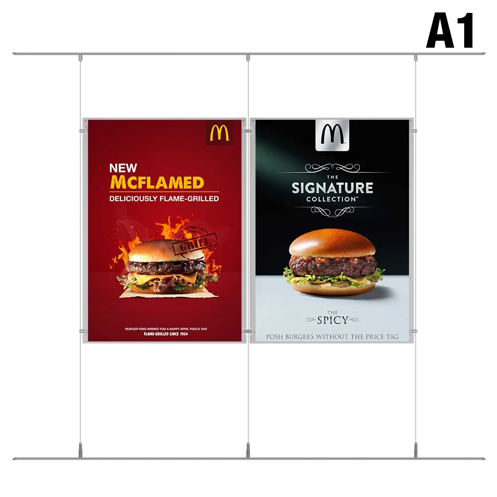 This hanging rail system is an easy way to display posters in storefront windows, where the dual-sided poster frame allow advertising to people inside and outside your business at once! There are two frames are made from 3mm thick clear acrylic with polished edges and can hold a total of (4) posters. Each frame is designed to display A1 (594 x 841mm) standard sized graphics in portrait orientation and have a slide-in design that makes changing posters in seconds easy with no tools necessary. There are small button magnets embedded within each side panel as well, keeping the frame shut and helping to prevent posters from sliding out of place.