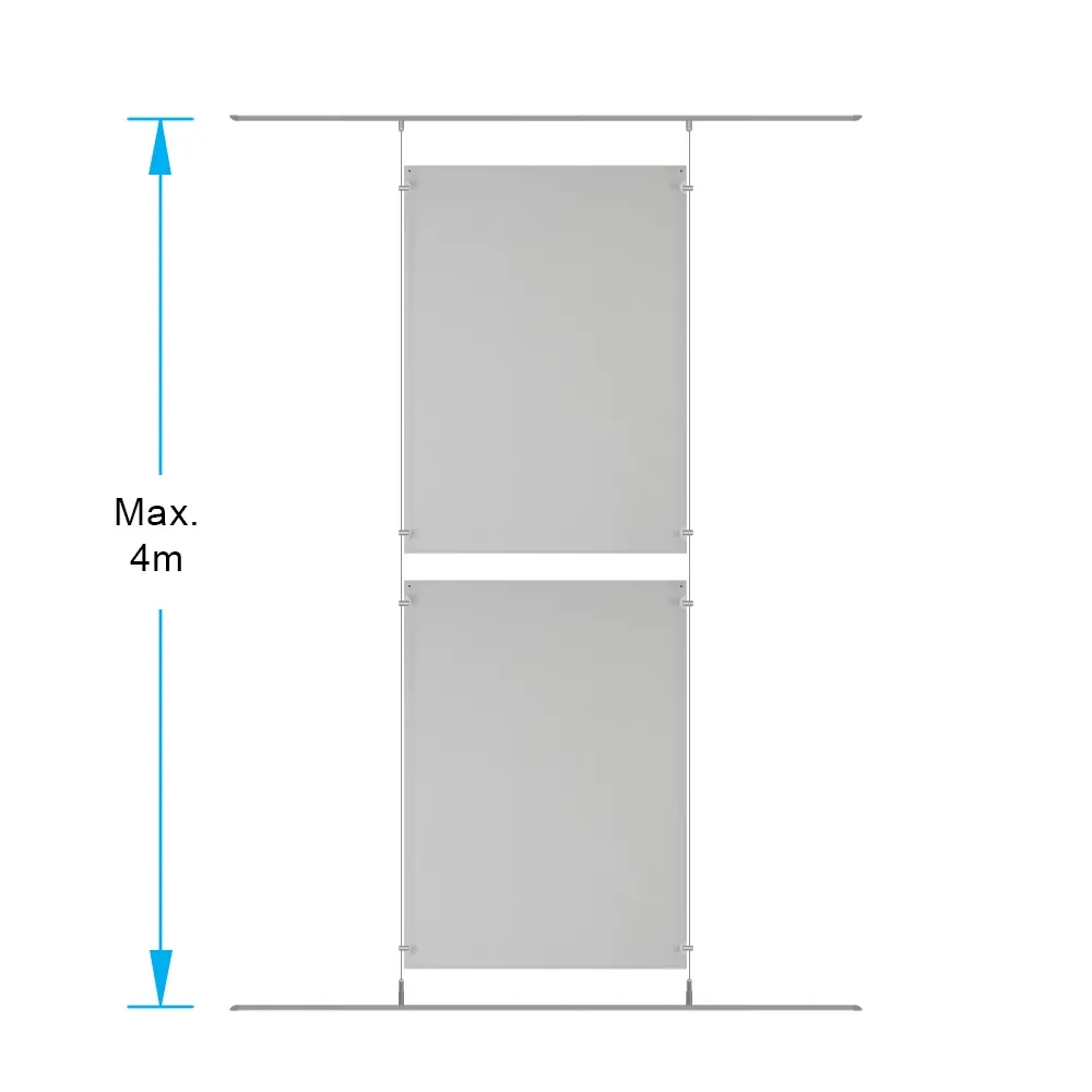 The window cable displays, part of our range of hanging display systems, use edge grip stand offs to attach the pockets to steel cables via small cut outs on each side of the holders. A hex key is provided to tighten the stand offs, which provide a floating effect with the holders that really draws in passersby. Our new rail system makes installation and positioning easier than ever, with fixings slid into place along the rail and then hand tightened to make the steel cable taut. Each aluminium rail is 1m long, with the cables offering 4m of length that can be cut to size to fit nearly any location's needs!