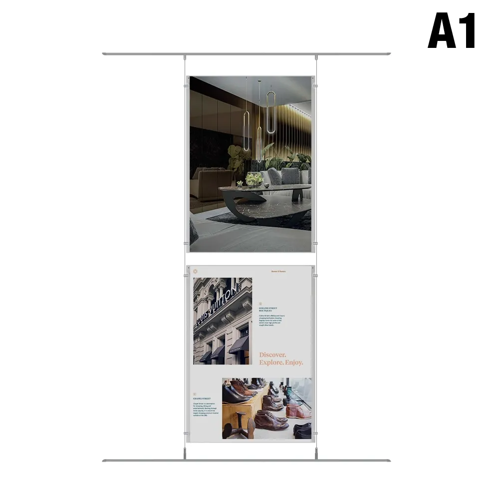 Window cable displays are used to create an eye-catching set of poster holders that are able to be seen in multiple directions at once thanks to the dual-sided pockets! The A1 hanging acrylic systems feature a 3mm thick clear acrylic pocket that provide a full view of displayed posters whilst protecting them from gathering dust or grime during display. The slide in design makes changing out signage quick and easy using no tools, with embedded button magnets helping keep the sides together and posters tightly in place! Different configurations are also available to suit different needs, with 2 pocket and four pocket arrays and heaps of other sizes and set-up options ready to choose from!