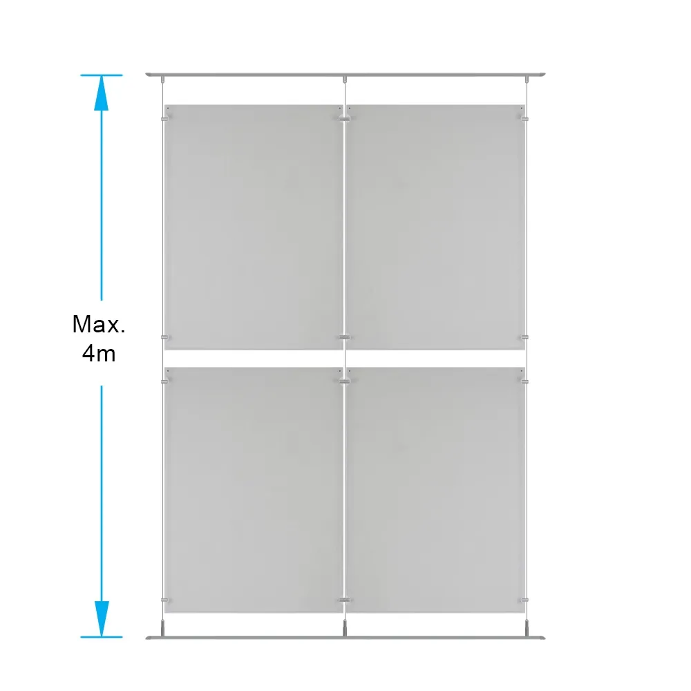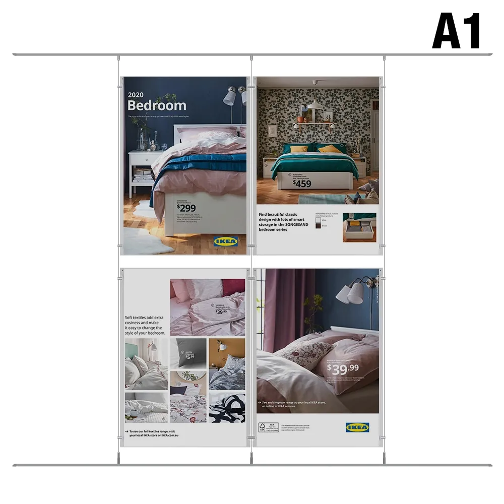 This suspended picture hanging system features a 2 x 2 array of poster frames that are dual-sided, typically used in storefront windows to reach visitors both inside and outside the business at once! The (4) poster holders display a total of (8) graphics, and have a slide-in design that makes changing out poster simple with no tools required. The frames are made from 3mm thick clear acrylic with polished edges and have small button magnets embedded within the side panels to prevent the sides from opening up whilst helping to keep posters in position. This style of poster display is found in real estate agencies, information centres, retail stores, museums, shopping centres, and more!s
