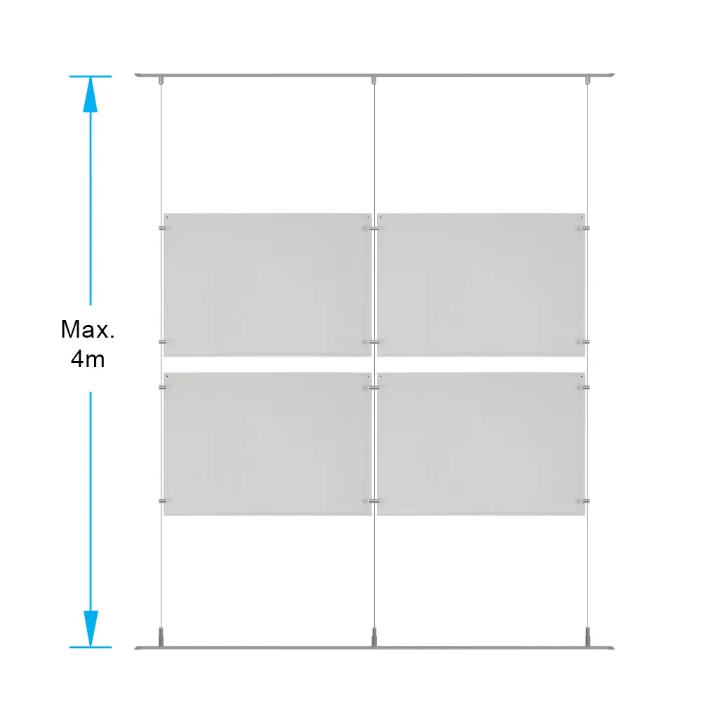 The hanging display system, like cable poster kits, use (2) 1m long aluminium rails to hold the cable fittings between the floor and ceiling. This makes installation simpler, as each fitting doesn't have to be individually installed like other models. There are (3) 4m long cables included that can each be cut to size to fit different spans, with a minimum 1282 x 855mm area needed to fit this entire array. The standoffs and joiners utilise an edge-grip to attach the frames to each other and the cables securely. Slimline Warehouse offers same day shipping to anywhere in Australia with this and most other in stock products when purchased by 3pm AEST, buy online today for fast dispatch to your location!
