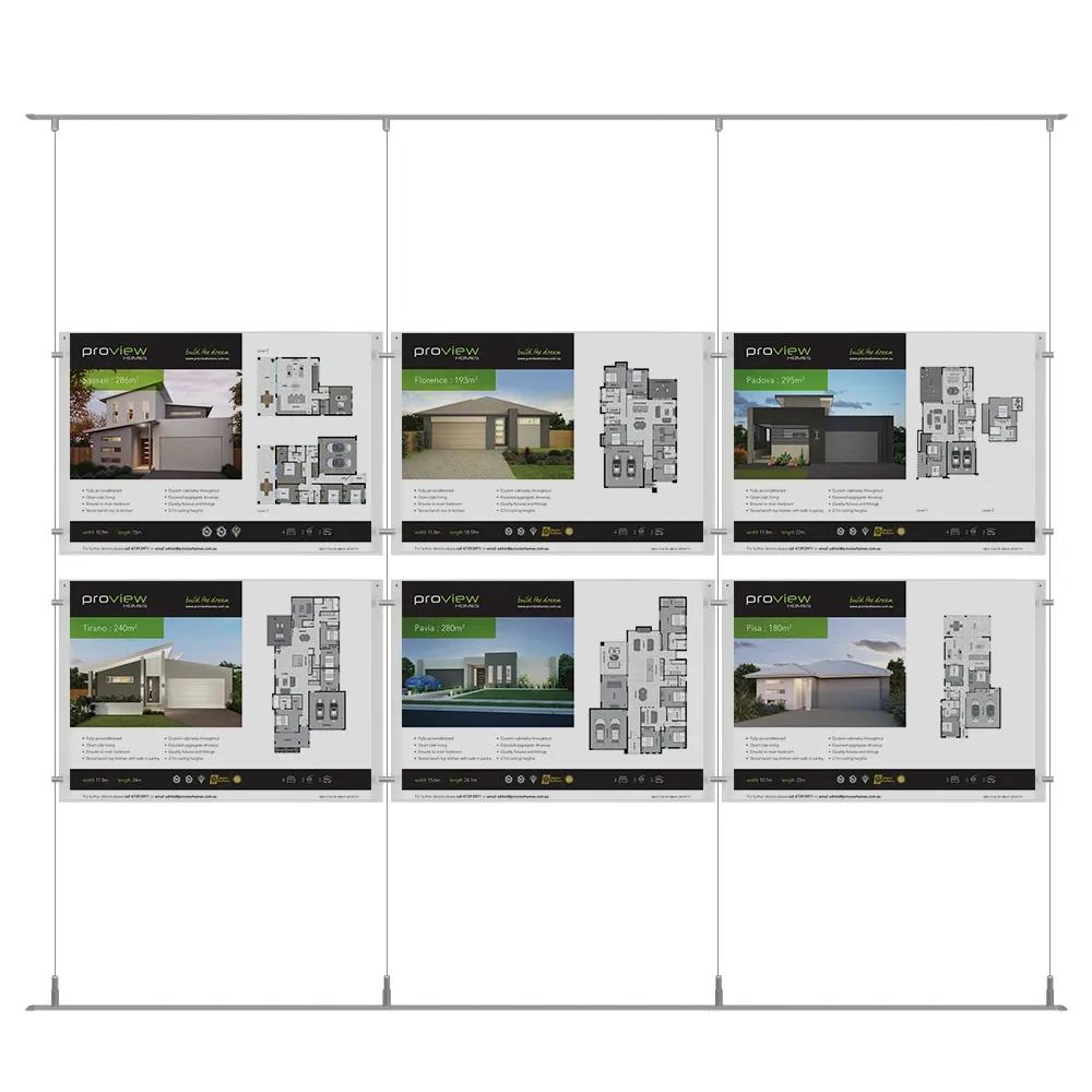 The hanging rail systems, like cable poster displays, suspended the frames using wires attached to (4) 1m long aluminium rails between the floor and ceiling. This system uses slide-in fittings that are easier to install than other display versions that each one has to be installed individually. There are (4) 4m long steel cables included that can be cut to size to accommodate most floor to ceiling spans, with a minimum 1923 x 855mm area needed to fit the entire unit. Standoffs and fittings use an edge grip to attach the frames to the wires and each other securely. Order by 3pm AEST for same day shipping to anywhere in Australia from Slimline Warehouse with this and most other in stock items.
