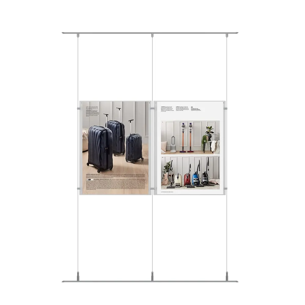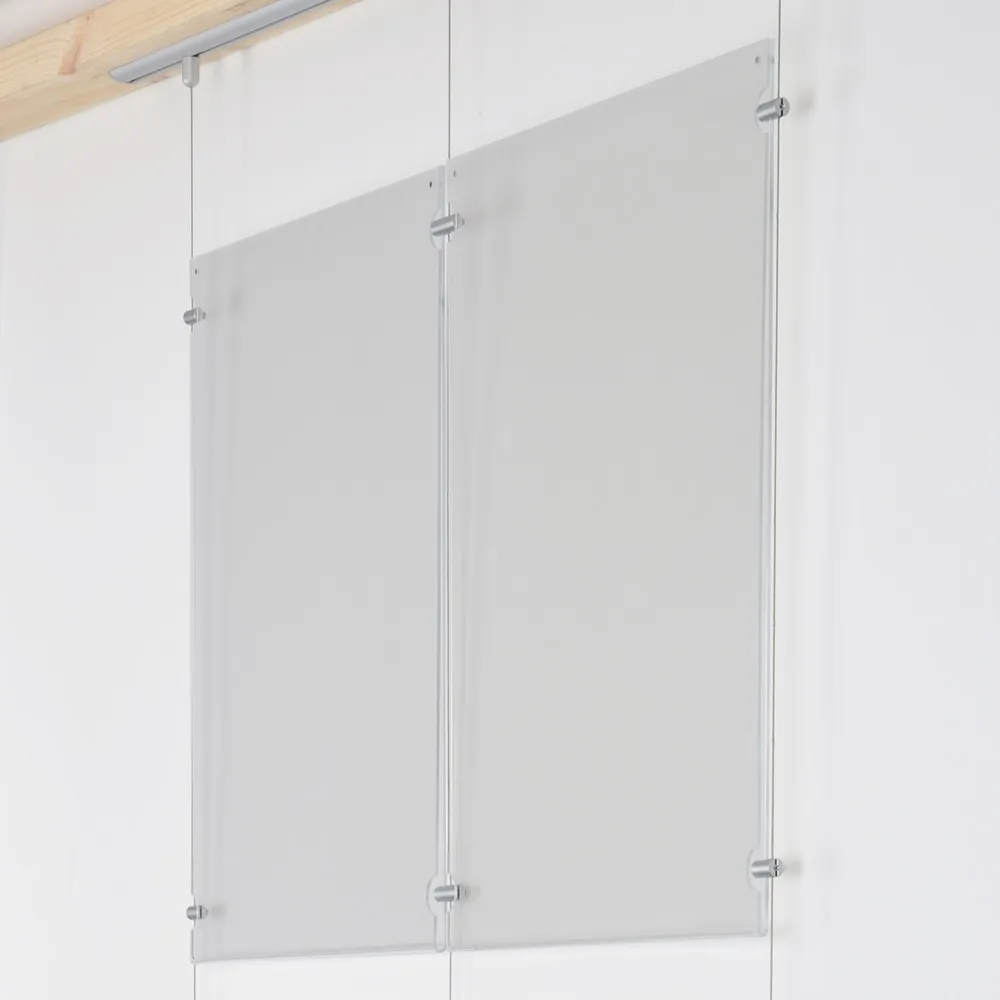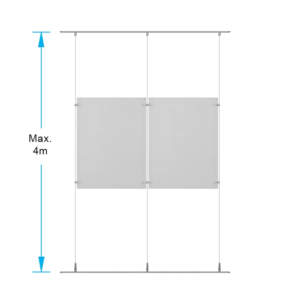 A hanging rail system, like suspended poster frames, creates a floating effect for the poster holders using a series of wires that attach to the frame securely using edge grip standoffs and joiners. There are (2) 1m long aluminium rails included that go along the floor and ceiling to make installation easy, with the fittings for the cables sliding into position instead of needing to be individually installed! The (3) cables are made from stainless steel and are 4m long, able to be cut to size to fit most spans, with a minimum 932 x 596mm area needed for the whole array. Order by 3pm AEST for same day shipping to anywhere in Australia with this and most other in stock products, only from Slimline Warehouse!