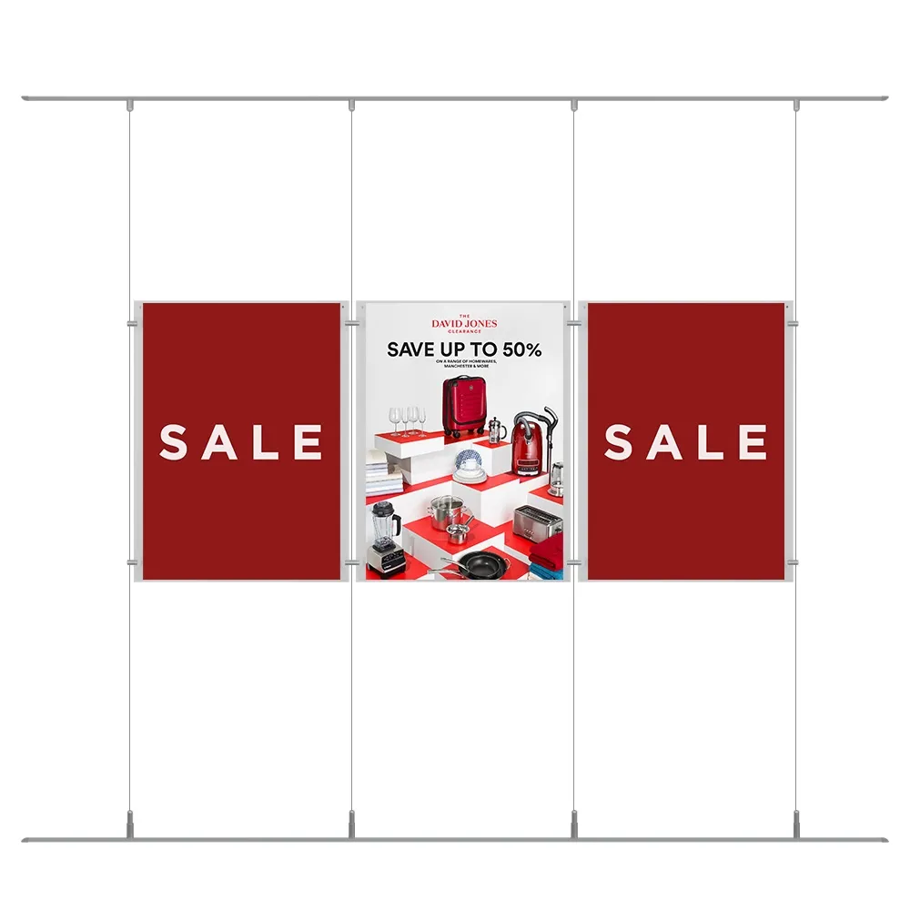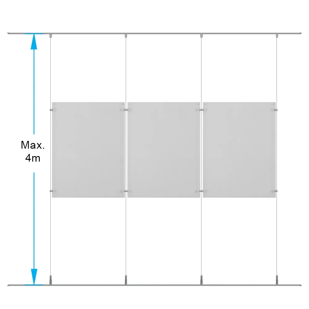The hanging cable sign, window display real estate includes (4) 1m long aluminium rails that are installed on the floor and ceiling to hold fittings for the steel cables for easier installation than other versions that require hardware to be individually placed. There are (4) 4m long cables included with this set that can be cut to size to fit most location spans, with a minimum 1398 x 596mm area required to fit this entire display set. Stainless steel standoffs and joiners use an edge grip to secure the frames to the wires and each other to create an eye-catching floating effect. Slimline Warehouse offers same day shipping to anywhere in Australia with this and most other in stock products if purchased by 3pm AEST, buy online today!