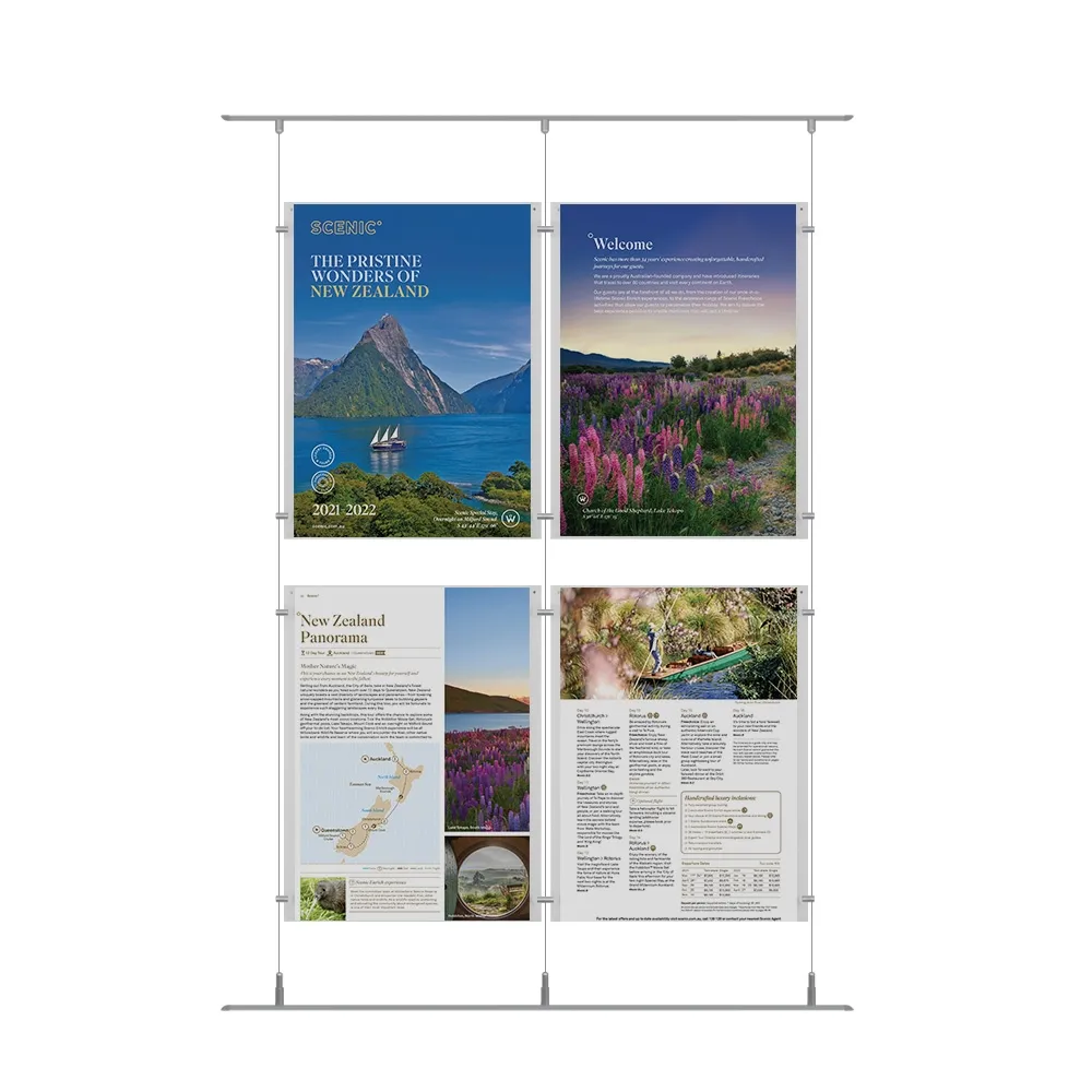 This estate agent window display use a 2 x 2 array of poster frames to easily draw attention of visitors thanks to the unique floating frame design. The holders are made from 3mm thick clear acrylic with polished edges and have small button magnets embedded within each side panel to help keep posters in place and to prevent the frame from from opening up. The poster holders are dual-sided, ideal for use in storefront windows where people inside and outside the business see promotional posters, destination information, property listings, and more. Each frame is designed to hold A2 (420 x 594mm) standard sized posters in portrait orientation.