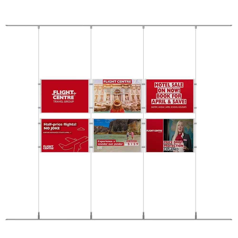 Poster hanging systems, like real estate window displays, included all hardware necessary for easy installation at your location. There are (2) aluminium rails included that are 1m long and positioned on the floor and ceiling, with fittings sliding into place along these rails to position the cables. This array needs a minimum 1398 x 615mm space for display, and there are (4) 4m cables that can be cut to size to accommodate different sizes of locations. The stainless steel joiners and standoffs use an edge grip to attach frames to each other and the cables securely whilst complementing the clear frames. Order by 3pm EST for same day shipping to anywhere in Australia with this and most other in stock products, only from Slimline Warehouse!