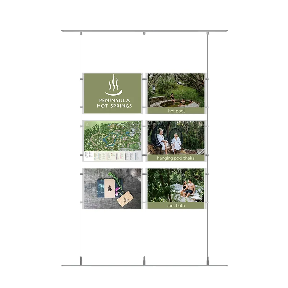This hanging rail system features a 3 x 2 array of poster frames that can be placed in storefront windows to reach out to people both inside and outside your business at the same time! The dual-sided poster holders display A3 (297 x 420mm) standard sized graphics that are in landscape orientation and use a slide-in design that makes change outs simple with no tools needed! The frames are made from 3mm thick clear acrylic to offer a full view of on display items and have small button magnets embedded inside each panel to keep the frames shut whilst preventing posters from sliding out of position.