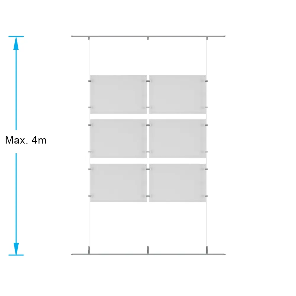 The hanging rail system, like cable poster signs, has (3) 4m long cables included to easily span the height of most spaces, with a minimum of 932 x 930mm area needed to fully assemble this array. The 1m long aluminium rails allow you to slide fittings for the cables into place along the floor and ceiling with ease. Standoffs and joiners made from stainless steel and use an edge grip to securely attach the frames to each other and the wire to create the floating effect. Slimline Warehouse offers same day shipping to anywhere in Australia wit this and most other in stock products if purchased by 3pm EST, buy online today for fast dispatch to you!