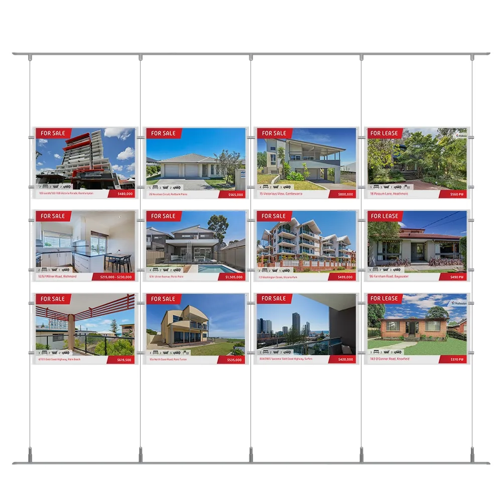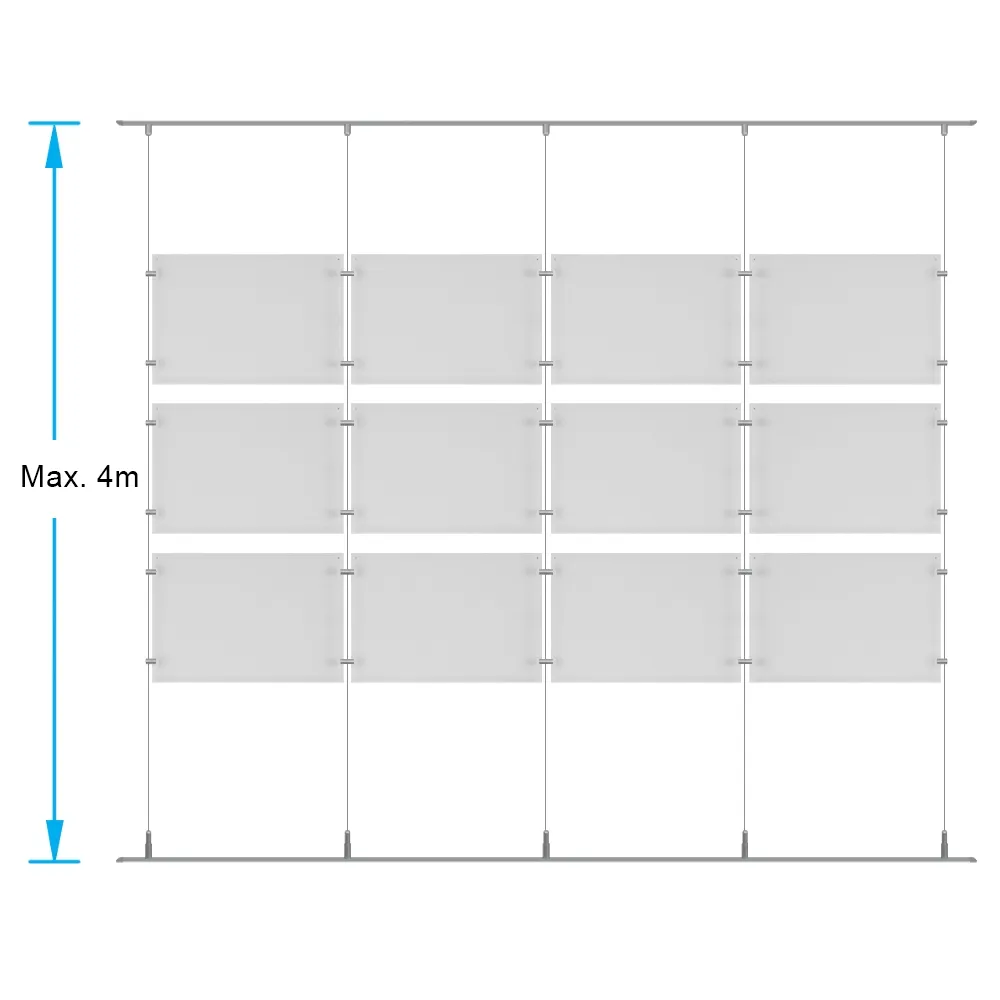 This retail cable display system has posters frames that display A3 (297 x 420mm) standard sized posters in landscape orientation. There are (12) dual-sided holders included that are fixed in a 3 x 4 array that can showcase (24) total posters at the same time, ideal for placement in storefront windows to reach passersby inside and outside the business at once. Each frame is made from 3mm thick clear acrylic to provide a full view of on display graphics and have small button magnets embedded within to keep posters in place and prevent posters from sliding out of position. This style of display is popularly used in real estate agencies, retail stores, information centres, museums, and travel agencies!