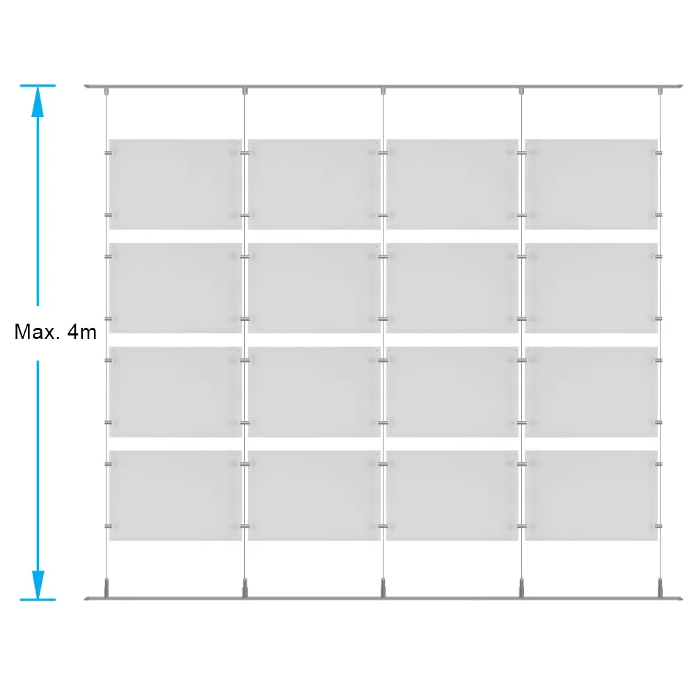The hanging poster sign, real estate displays uses (4) 1m long aluminium rails for installation, an improved kit that allows fittings that hold the wires to be slid in to position rather than individually installed. The (5) included cables are 4m long and can be cut to size to easily accommodate nearly any span, with the full 4 x 4 array needing a 1384 x 1745mm minimum space for set-up. Edge grip standoffs and joiners attach the holders to the wires securely, with a silver finish that complements the frames nicely. Slimline Warehouse has same day shipping available with this and most other in stock products if bought by 3pm EST, buy online today for fast shipping Australia-wide!