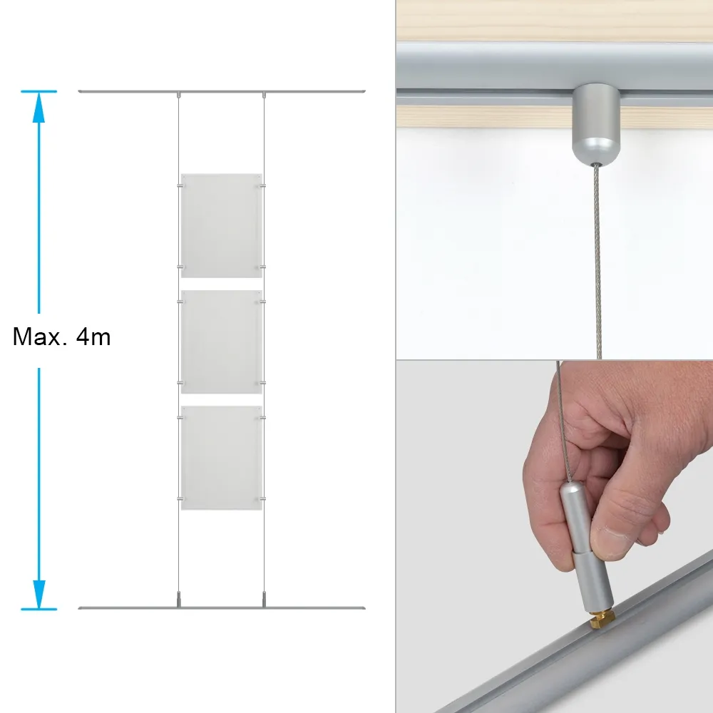 - Cut steel cables to needed size to easily hang poster holders between rails