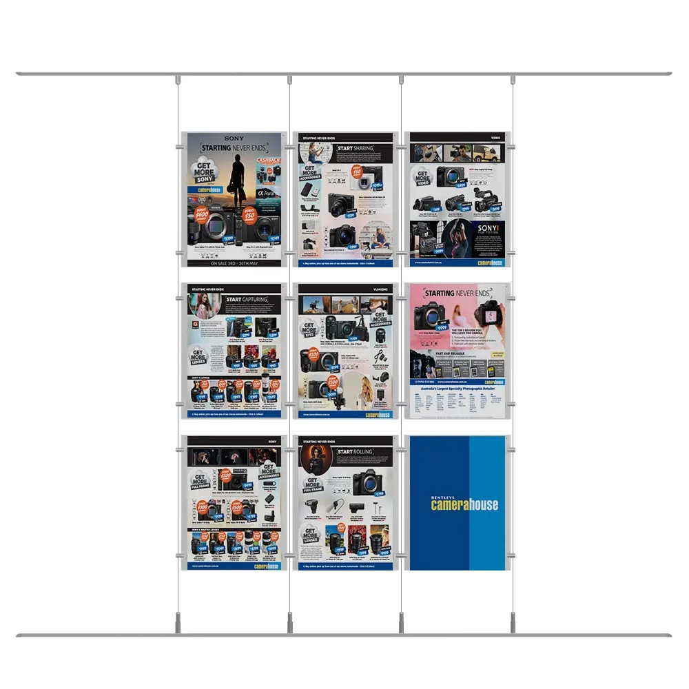 Hanging rail systems are great for displaying real estate listings, promotional posters, informational graphics and more in many locations! This set has a 3 x 3 matrix with the (9) poster frames made from 3mm thick clear acrylic to offer full view of on display posters. The frames are designed to hold A3 (297 x 420mm) graphics that are in portrait orientation and are dual-sided to display (18) total posters at once! The slide-in design makes it easy to switch out posters with no tools needed in seconds, and small button magnets are embedded in each side panel to keep graphics in place and prevent the frame from opening up.